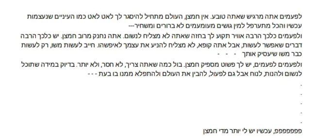 אני לא רוצה שתספר לי מה היה, רק שתדע שאני פה בשבילך בכל שעה.