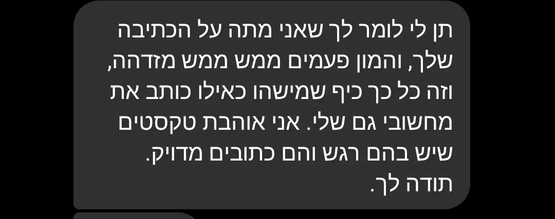 אין לה מילים לתשובה. ישנם רגעים בהם אין מילה, רק מראה, והוא חזק מכל.