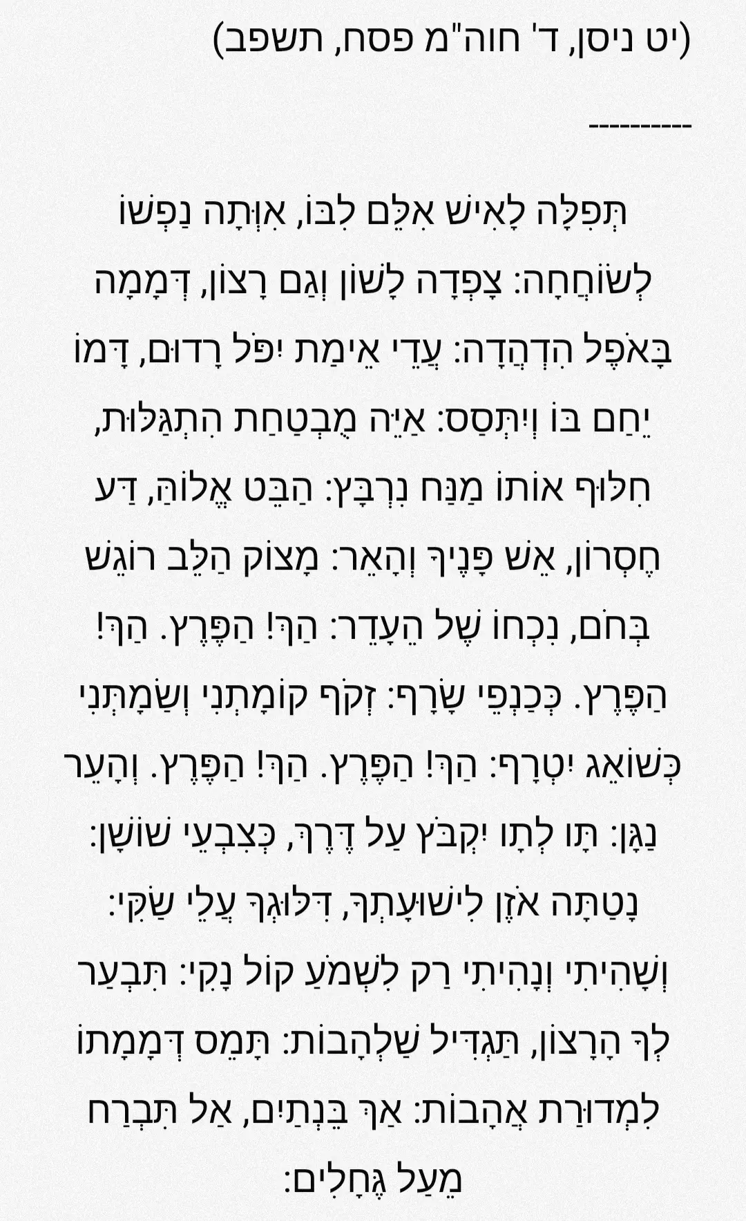 ''רבי יהודה הלוי כתב פיוט מתוק לשביעי של פסח.'' הוא נזכר פתאום. ''ובין כל ההלל והשירה על הנס הוא מדבר את התפילה הזאת, הרצון לגאולה שהיא שלמה.''