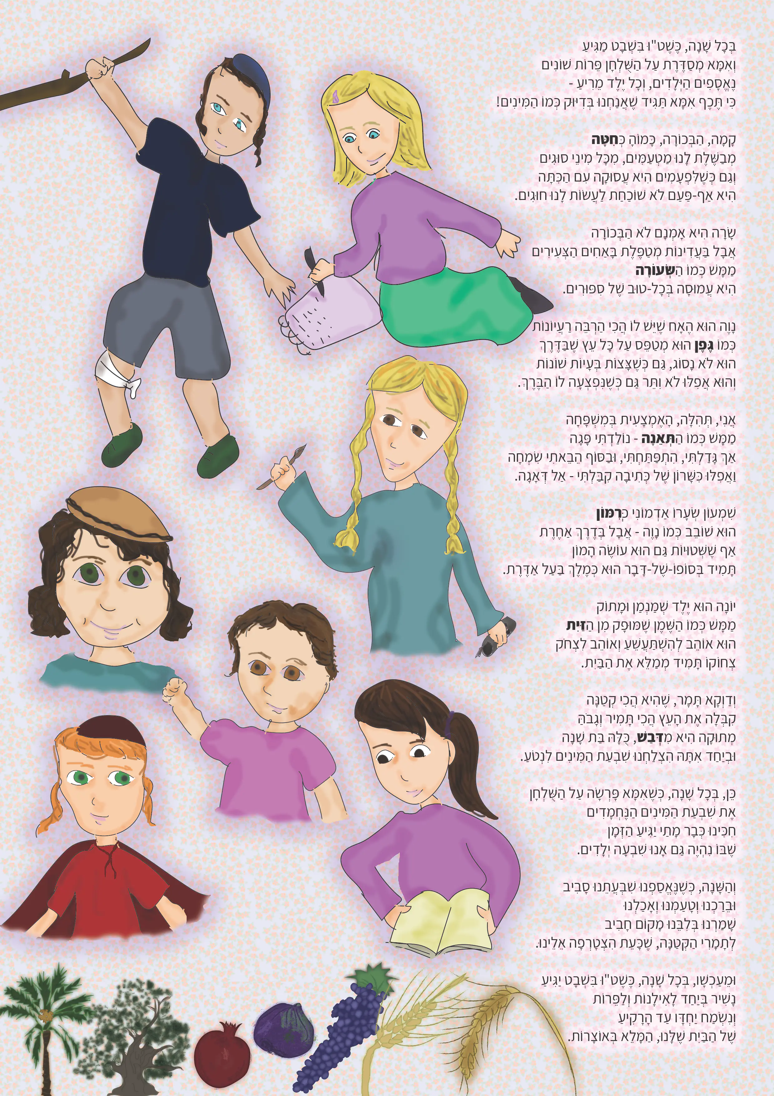 בתחלה מה שיש מ7 המינים (לא אוכלים אצלינו תאנים בגלל תולעים ולא חיטה ושעורה כי אוכלים רק פרי העץ אז יוצא 4) ואז לפי סדר הגיל כל ילד בוחר איזה פרי יאכלו.
