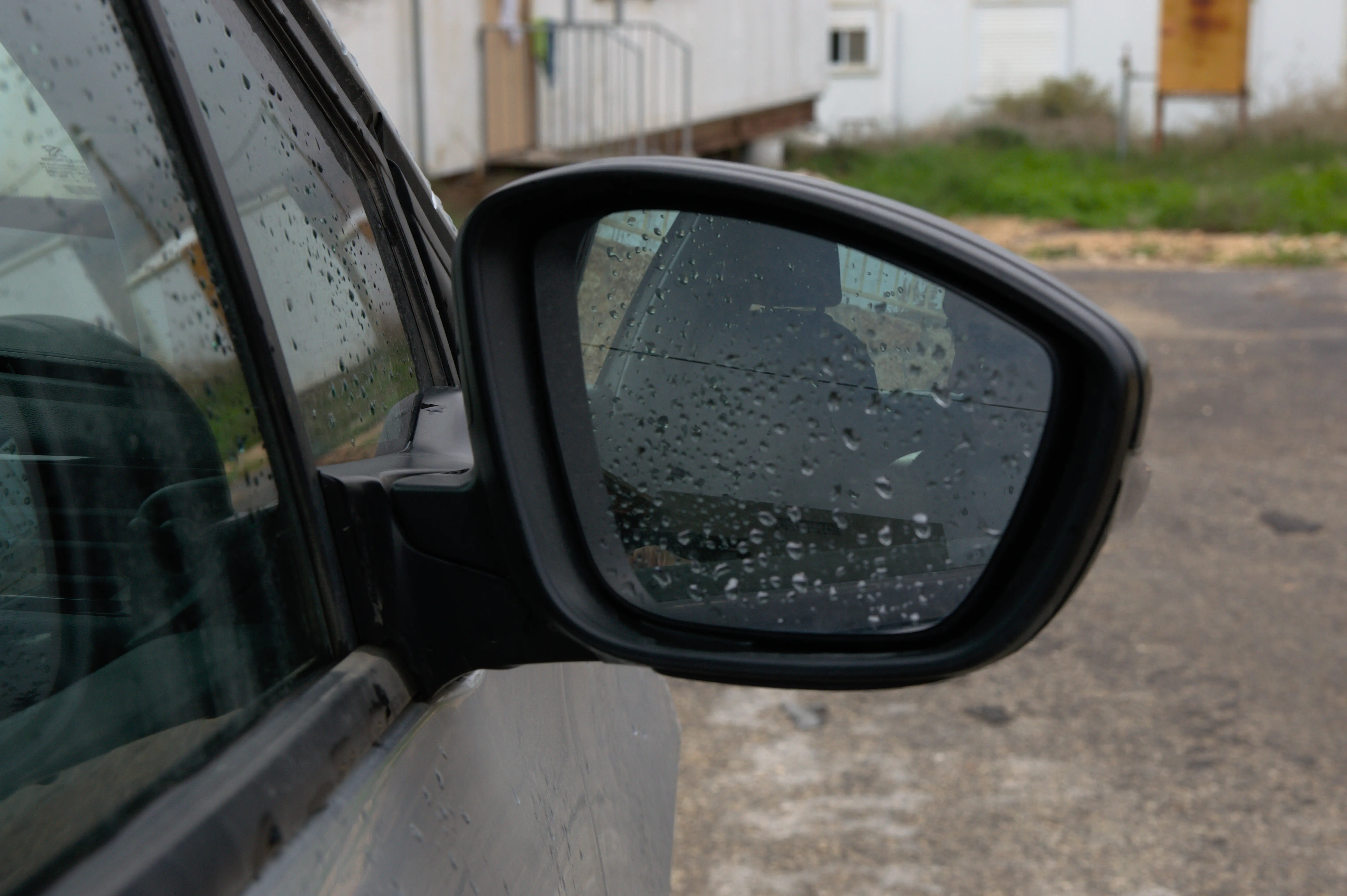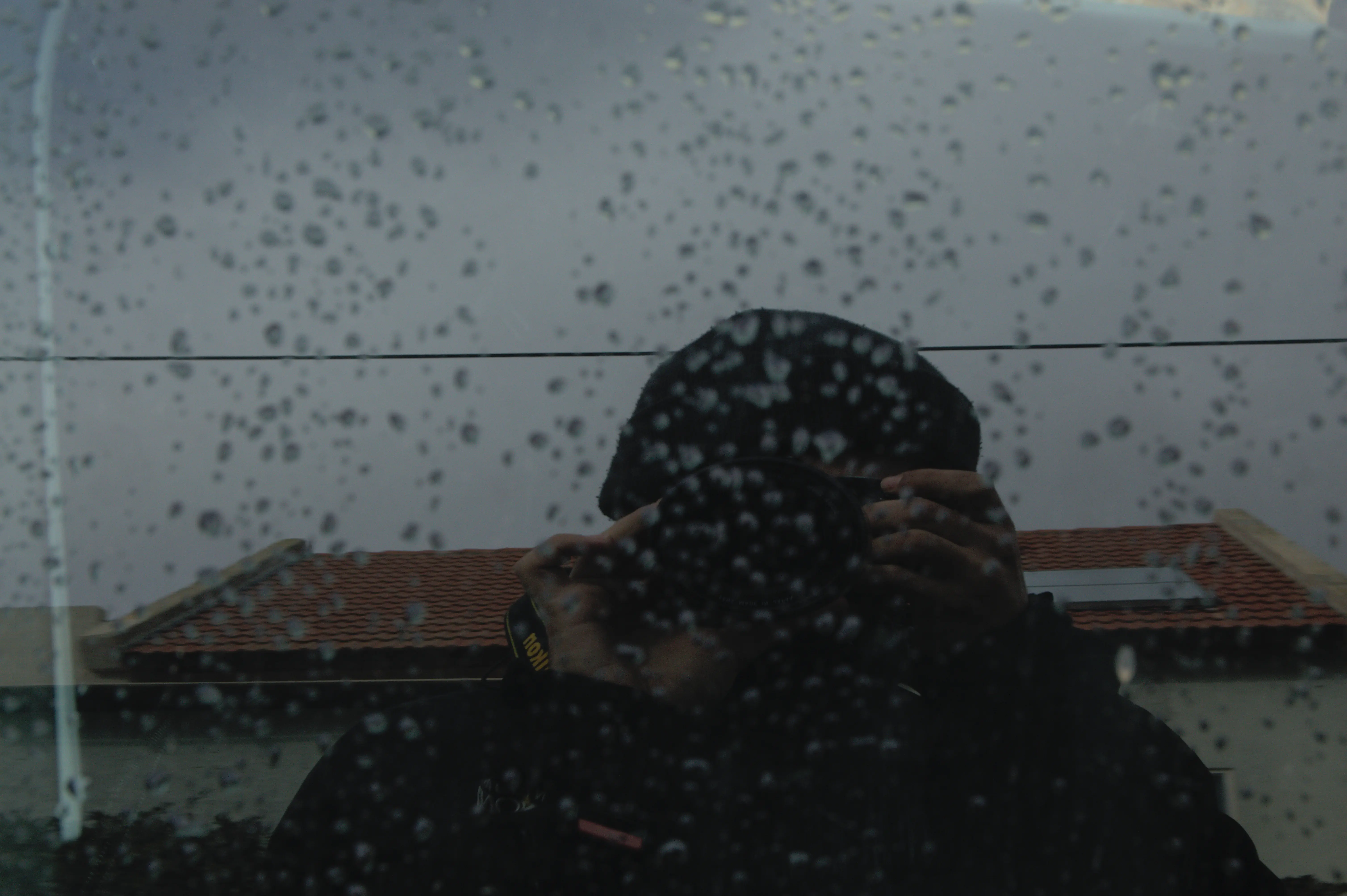 בהשתקפות שלי בחלון של הרכב ביחד הפליז הכובע והמצלמה אני נראההר ומדבר