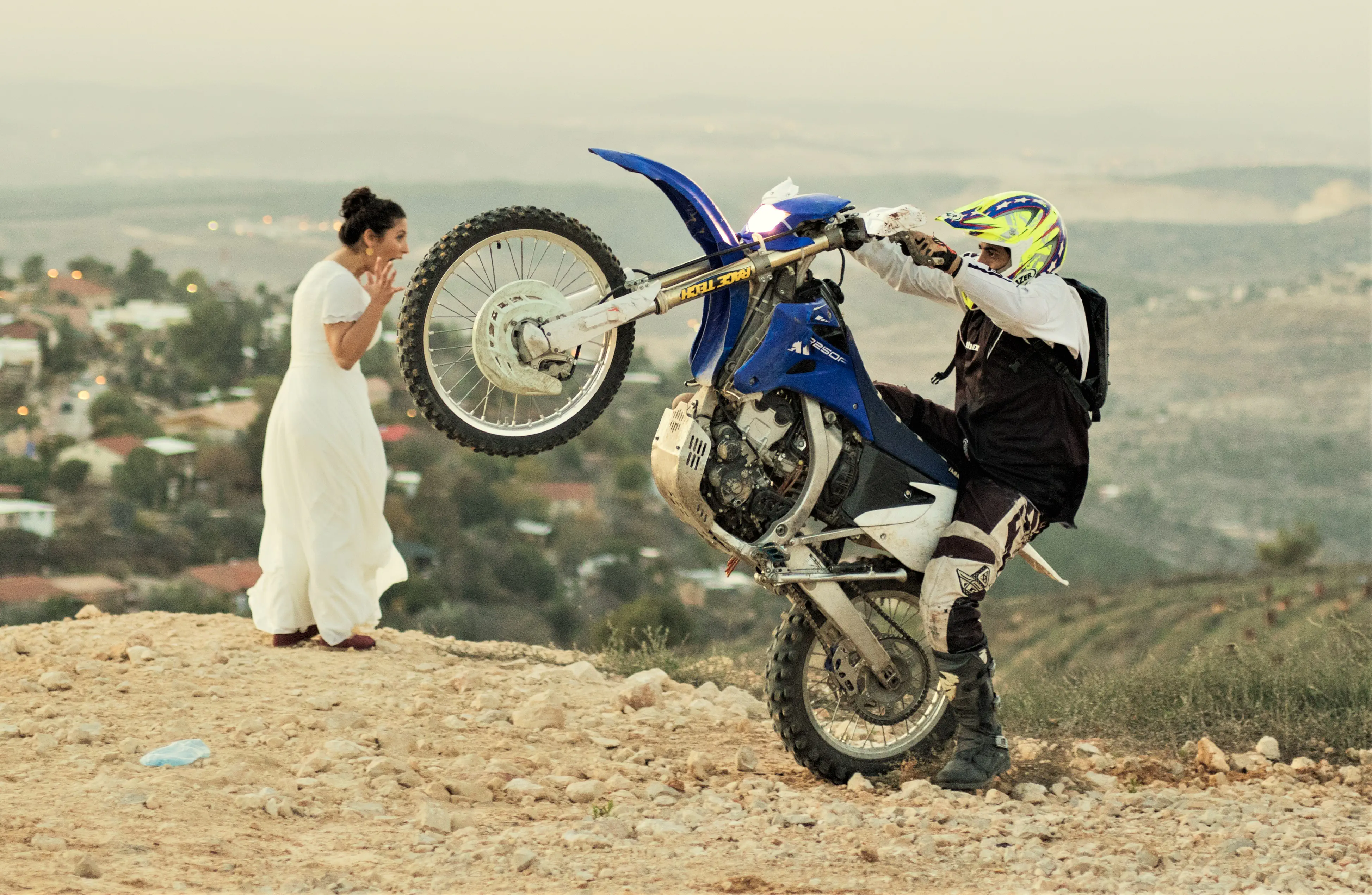 התמונה מבויימת, אבל המצולמים אותנטיים - אופנוען וכלה שנפגשו במקרה לעשות תמונה, ואני הייתי שם לצלם שקיעה וקיבלתי רשות להשתמש בתמונות.