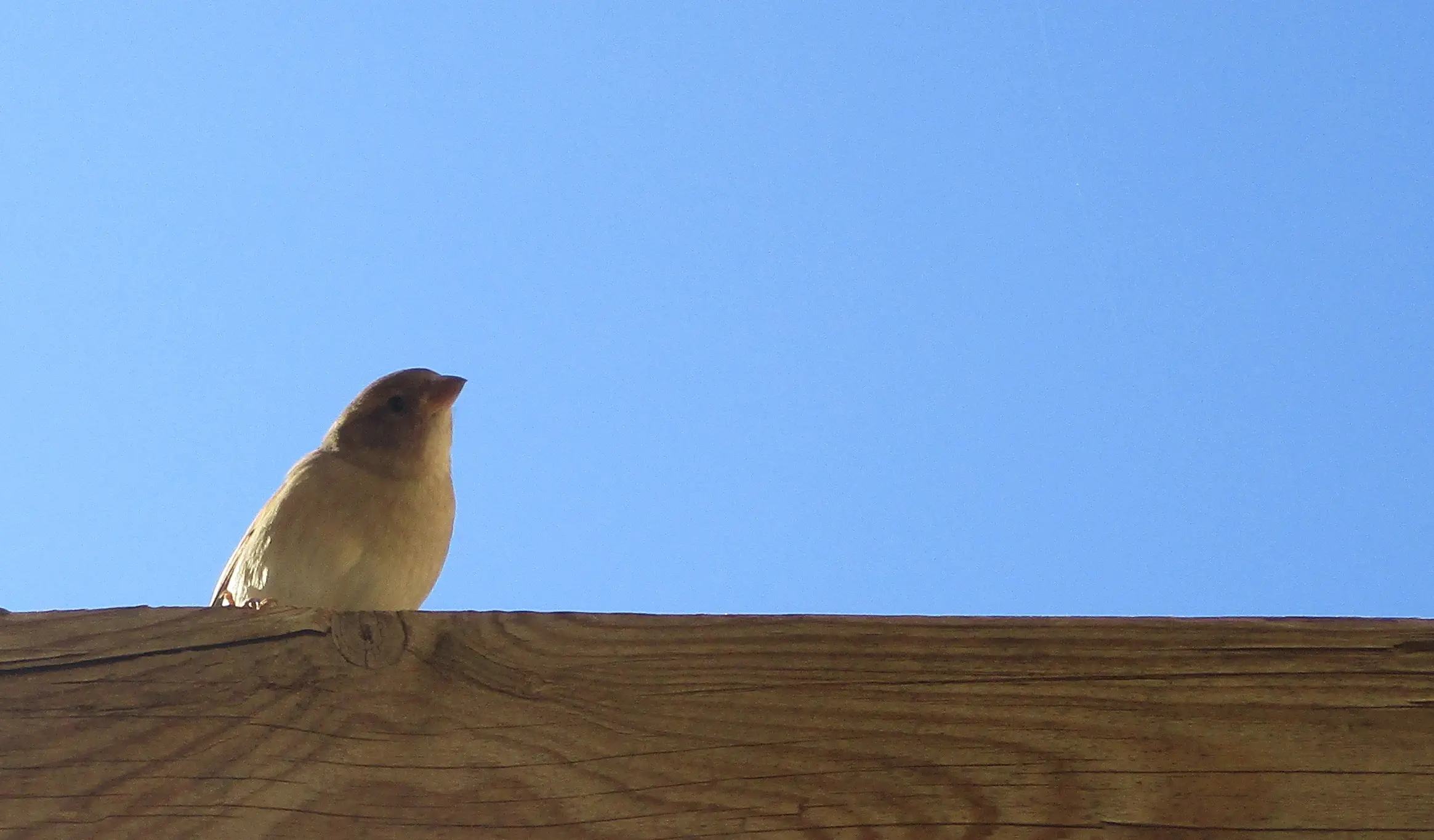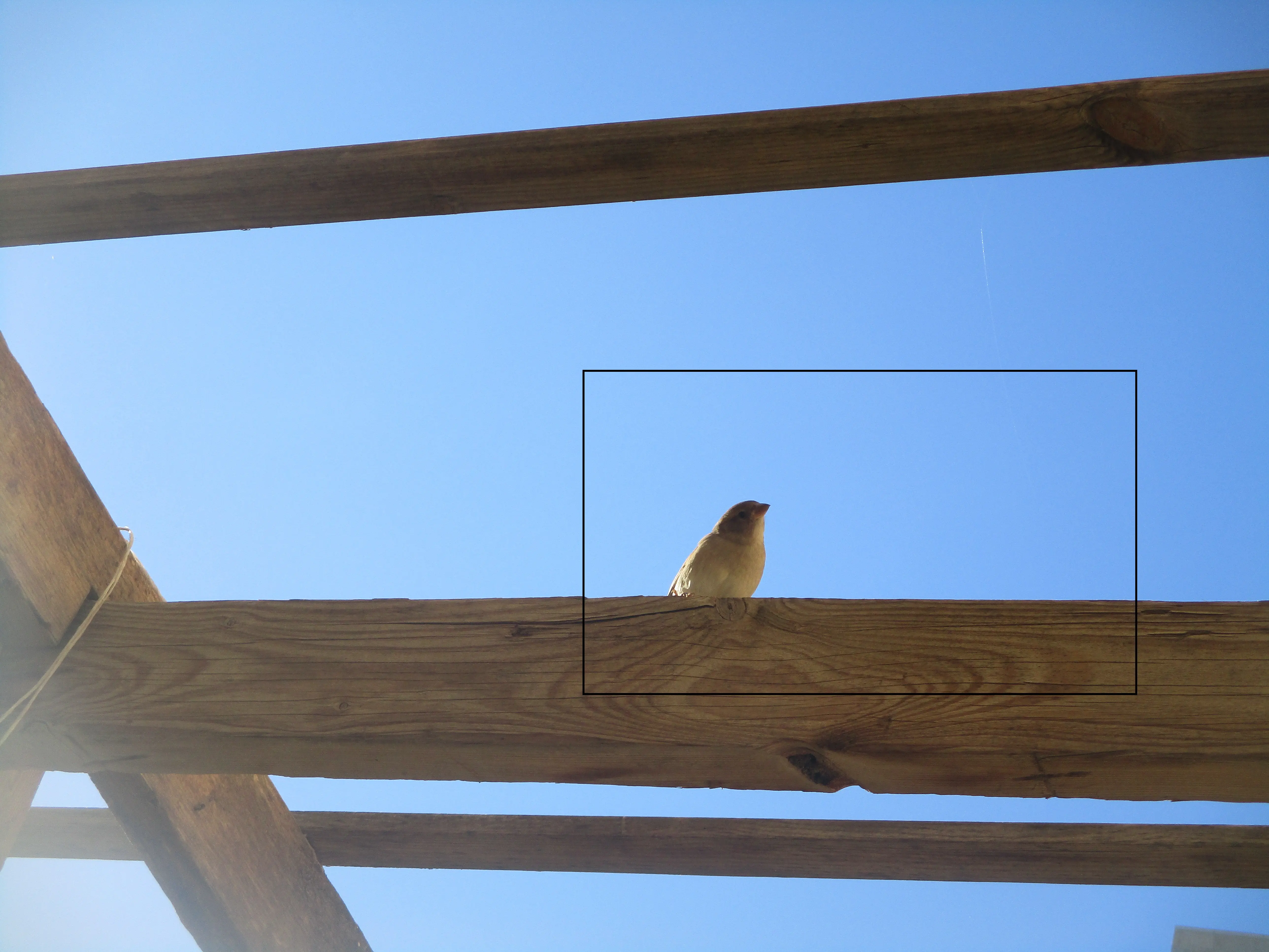 כאן רואים שהציפור עומדת על גג מעץ. אם היית מתקרבת/עושה זום היו רואים ציפור עומדת על עץ.