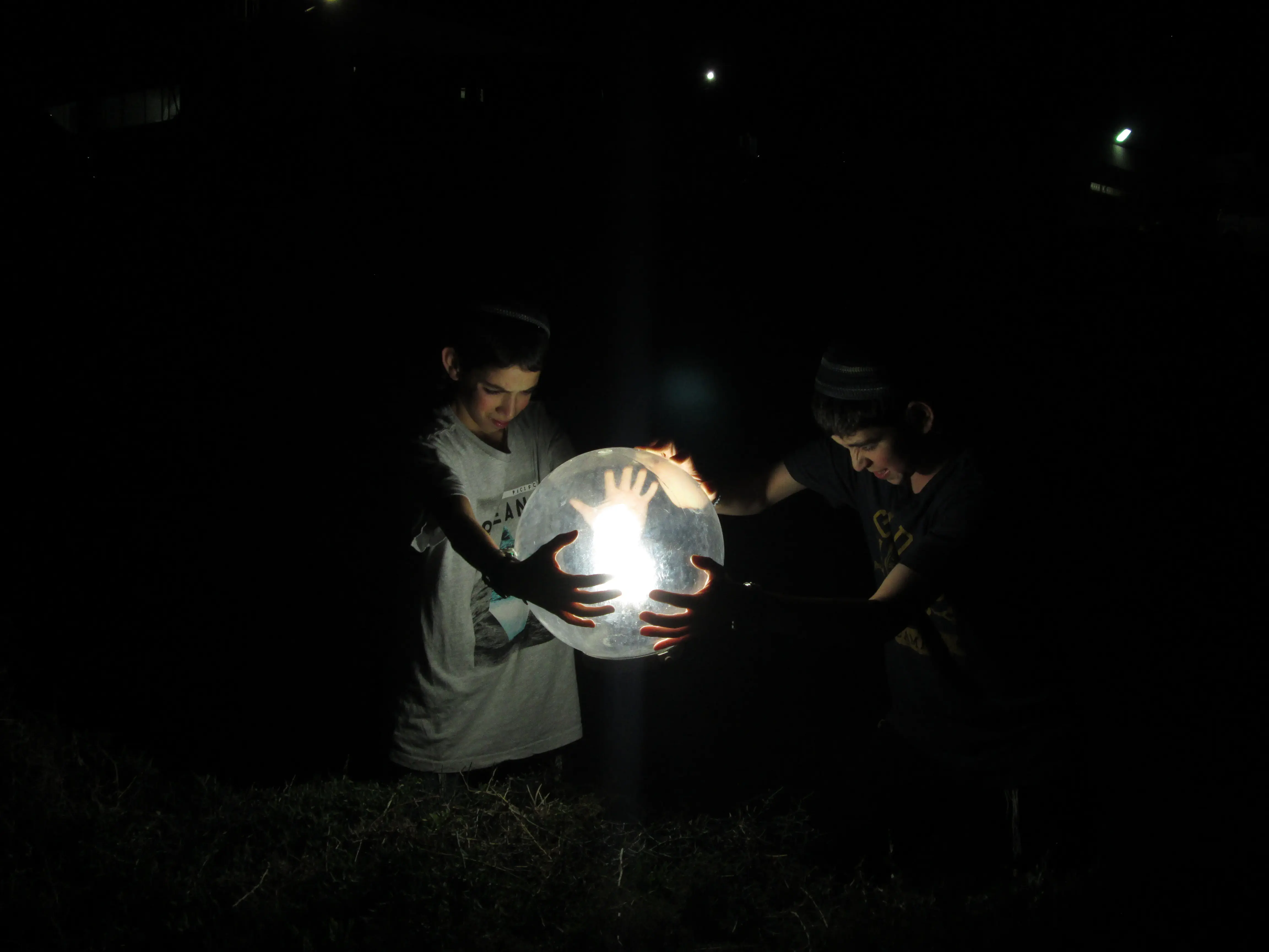 בשניה אחים שלי נוגעים בפלסטיק שמכסה מנורת גינה ככה שרואים להם קצת מהגוף
