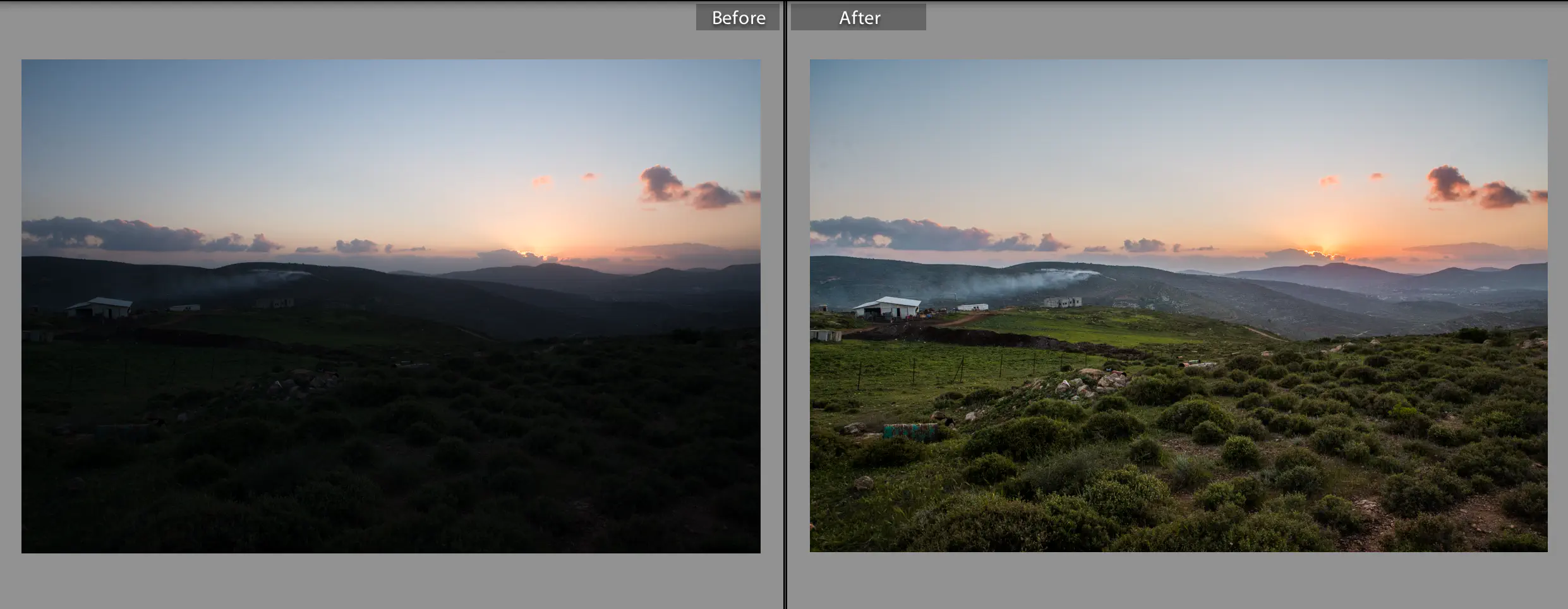 צילמתי תמונה חשוכה יחסית (שימו לב שבתמונת המקור לא רואים את החלק התחתון כמעט בכלל) ובלייטרום - פתחתי את הצללים (shadows וblacks) ככה שיצאה לי תמונה שקרובה הרבה יותר למציאות.