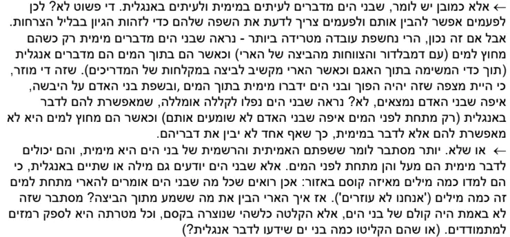 אני חשבתי על שני פתרונות הגיוניים, מעל פני הים, לבני הים קשה יותר לעשות דברים אז הם מצליחים לדבר רק בשפת האם שלהם- מימית, אבל בתוך המים זה לא קשה להם, כמו שהיה כתוב שם בני הים לא יודעים אנגלית ולמדו כמה מילים רק בשביל הטורניר