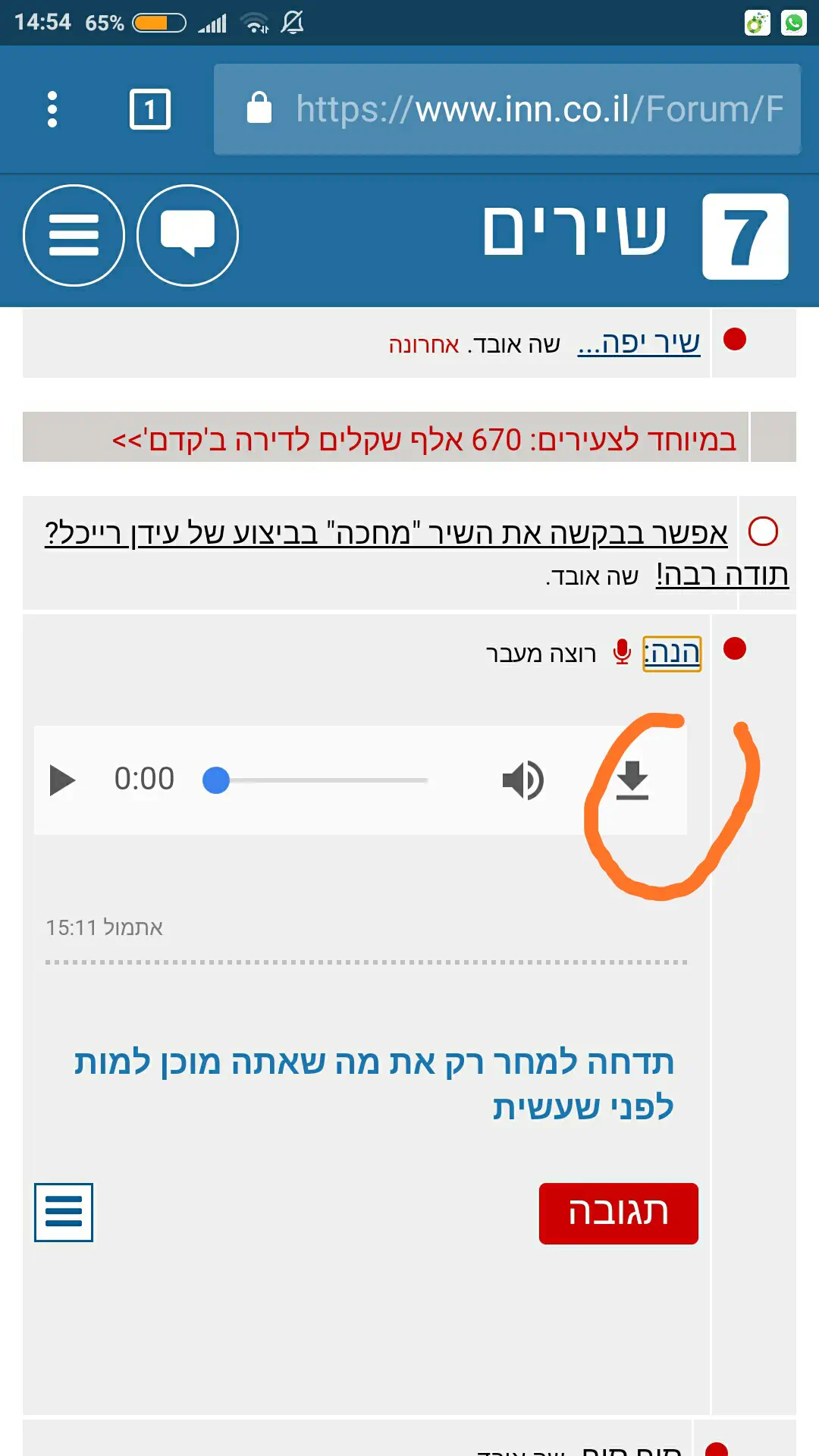 לשלוח לך באישי ושם תלחץ לחצן ימני בעככבר על הכותרת של השיר ותעשה שמור ישור בשם. וזה יוריד.