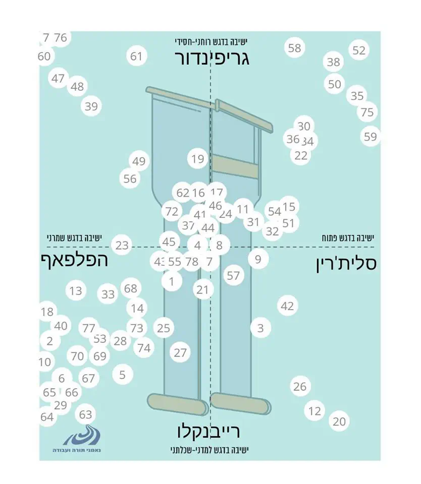 נאמני תורה ועבודה עשו פעם מיפוי של הישיבות המגזריות (מסומנות במספרים) לפי אופי הישיבות בשביל בחורים שמחפשים ישיבה. אז הוספתי להם למפה את הבתים של הוגוורטס