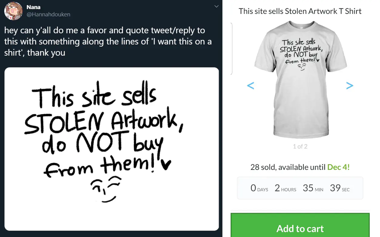 מספר אנשים נענו לבקשה, והפלא ופלא! כמה ימים מאוחר יותר שיתפו כתגובה אתר המוכר חולצות בהדפסים מרהיבים, וגם חולצה ועליה התמונה, "אתר זה מוכר תמונות של אמנים ללא רשותם!"