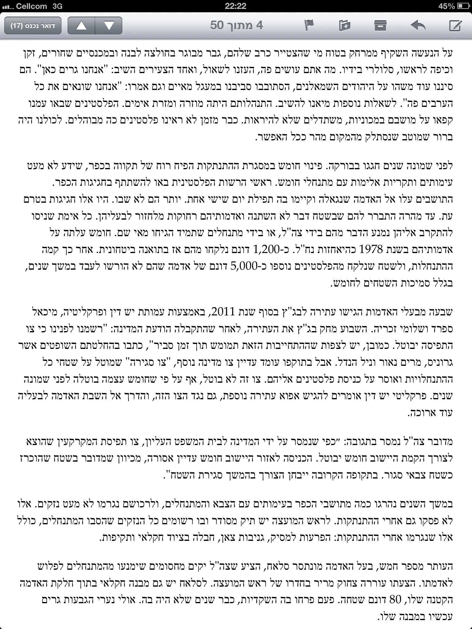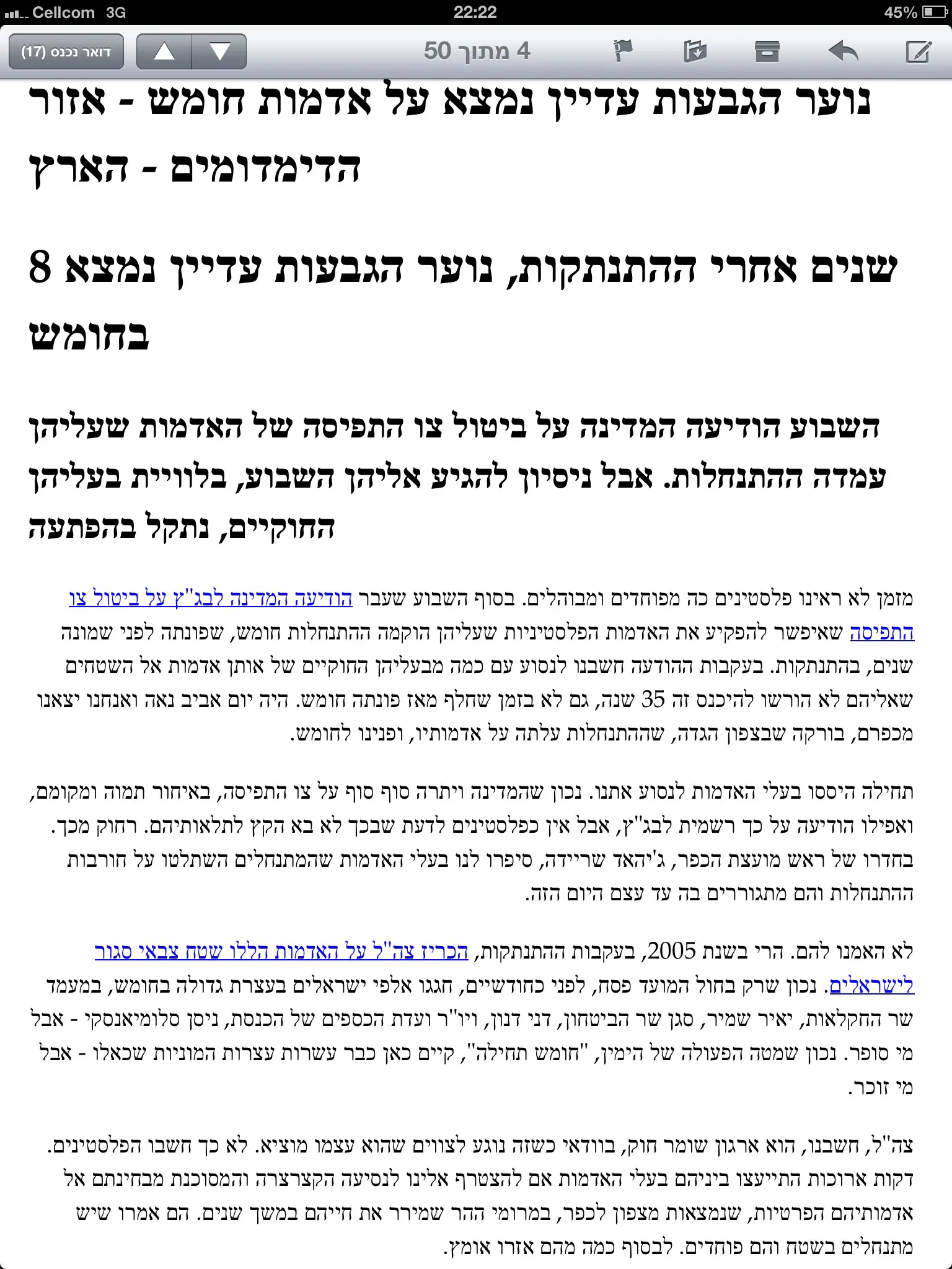 בחור ביקר גם הוא את המהלכים האחרונים וכתב: "גם אם אתה לא מסכים עם הדרך, אתה בשום אופן לא יכול לזרוק אבנים על חיילים". הוא נענה על ידי גולש אחר שהשיב: "אם אני יודע שזה מה שמגן על הבית שלי אז כן אני לא רוצה להיות כמו אחינו מגוש קטיף, שאין להם כמעט מקום לגור. אני אקדים תרופה למכה".