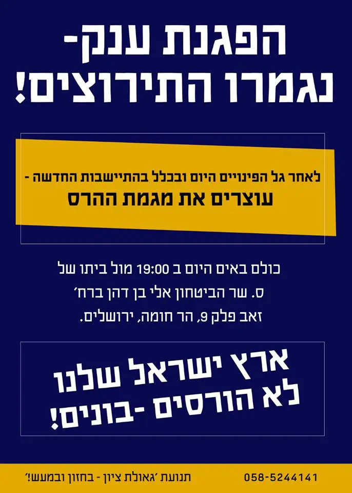 לאחר גל הפינויים היום ובכלל בהתיישבות החדשה - עוצרים את מגמת ההרס! כולם באים היום ב 19:00 מול ביתו של ס. שר הביטחון אלי בן דהן ברח' זאב פלק 9, הר חומה, ירושלים.