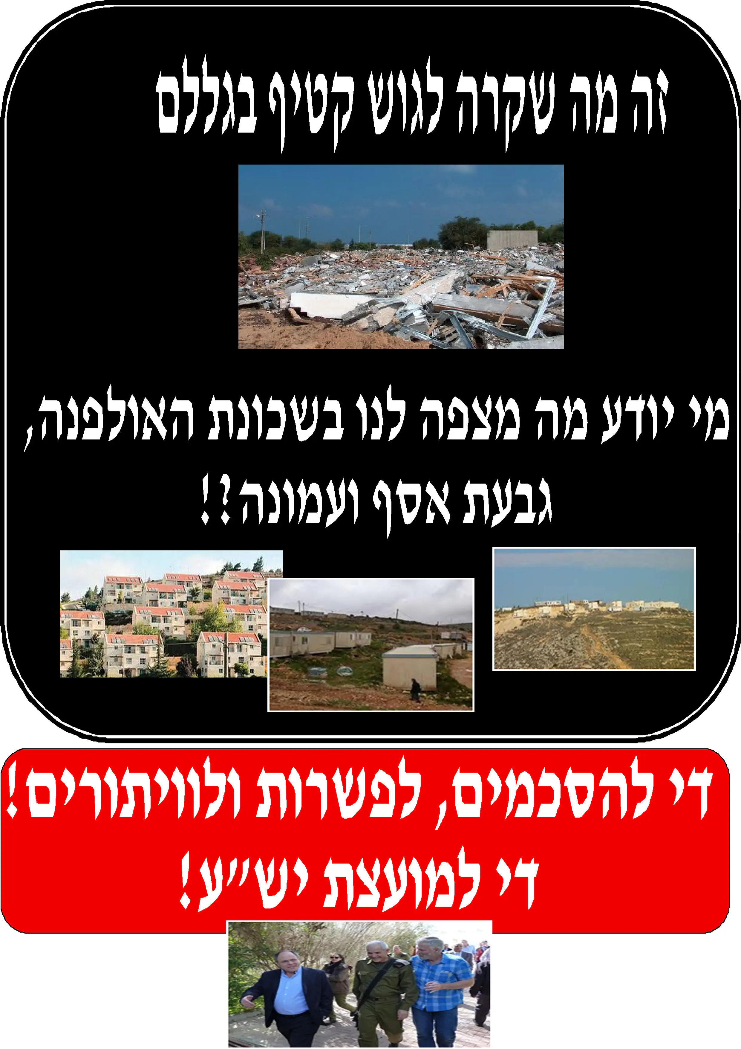 לעניות דעתי אתם צריכים ללמוד מהחרדים מה הם עושים?בנו את ביתר עילית הנה;זה קם עם 5000 תושבים ועכשיו 50000 תושבים אז אולי במקום לבנות כל יומים מאחז אחר תקחו ישוב קטן ותהפכו אותו לעיר?