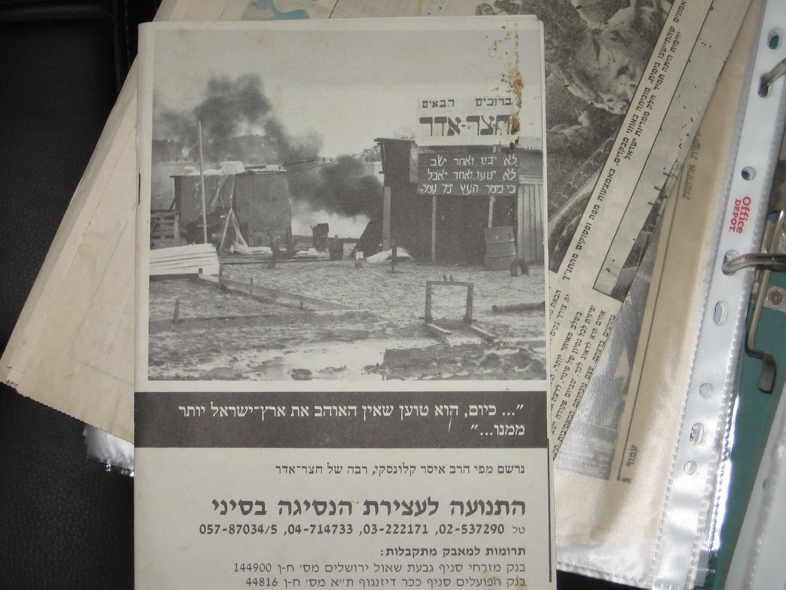 הרב קלונסקי: נשארנו למעשה עד סוף ניסן בחצר אדר בעלייה החמישית. לפני הגירוש הסופי מסיני, כל האנשים עלו על גג מבנה, וקשרו את עצמם בשלשלאות אחד לשני, במטרה להקשות על הצבא. ביקשו ממני לומר כמה דברים, ואמרתי שלושה דברים: לאנשי חצר אדר, לאדמה ולחיילים. לתושבים אמרתי, אל תבכו, אנחנו עוד נחזור לכאן. לאדמה אמרתי, זאת ארץ ישראל ואני מבטיח שנחזור ליישב אותך. לחיילים אמרתי, אתם מוזמנים לשתות אתנו קפה בפעם הבאה שנקים מחדש את חצר אדר.