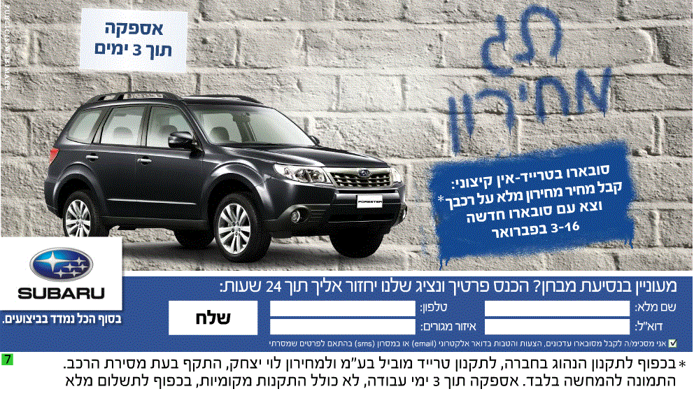עוד תהיה על זה כתבה בערוץ 2 על שימוש ציני בתמונה, וסירטוט תג מחיר על פרסומות של סובארו.