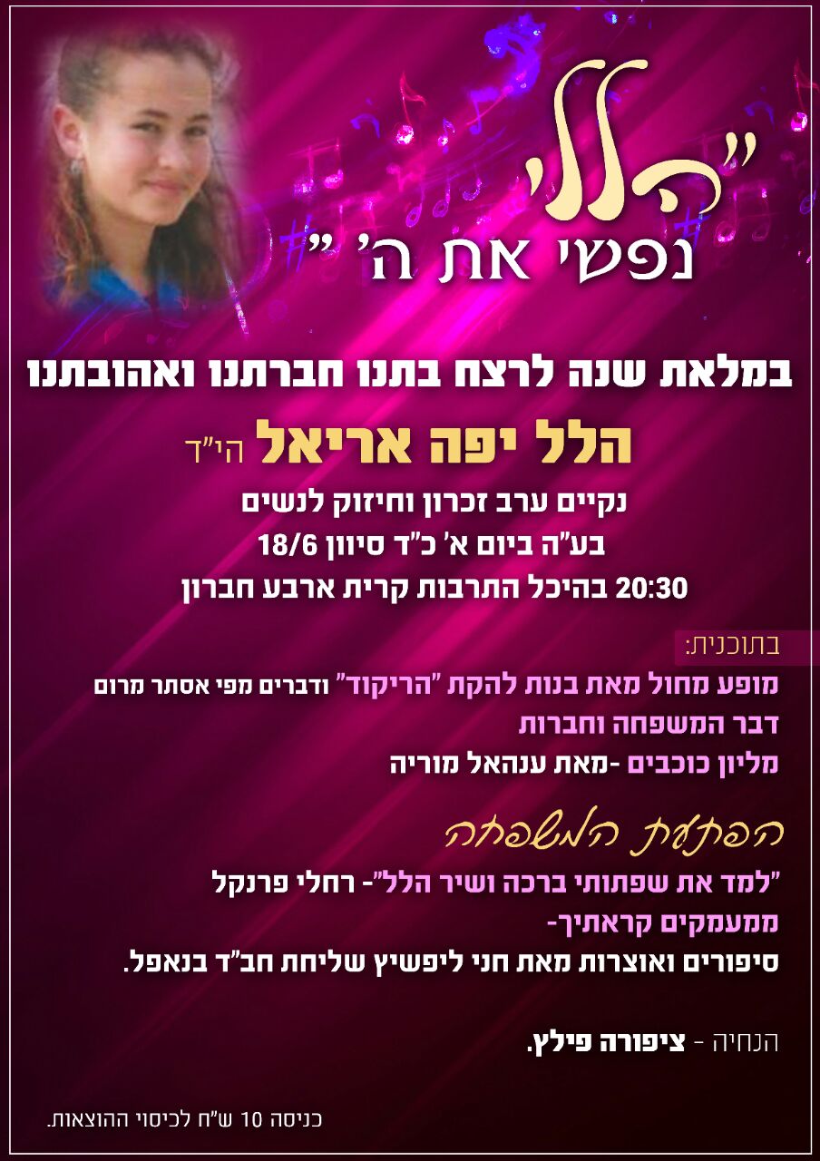 בעזרתו ביום חמישי הזה יהיה יום עבודה בגבעה לבנות בבוקר ובנוסף מי שיכולה צריך מחר כמה בנות שיסעו לגבעה להשקות עצים כי אם לא הכל מתייבש ואין יום עבודה ולא עצים