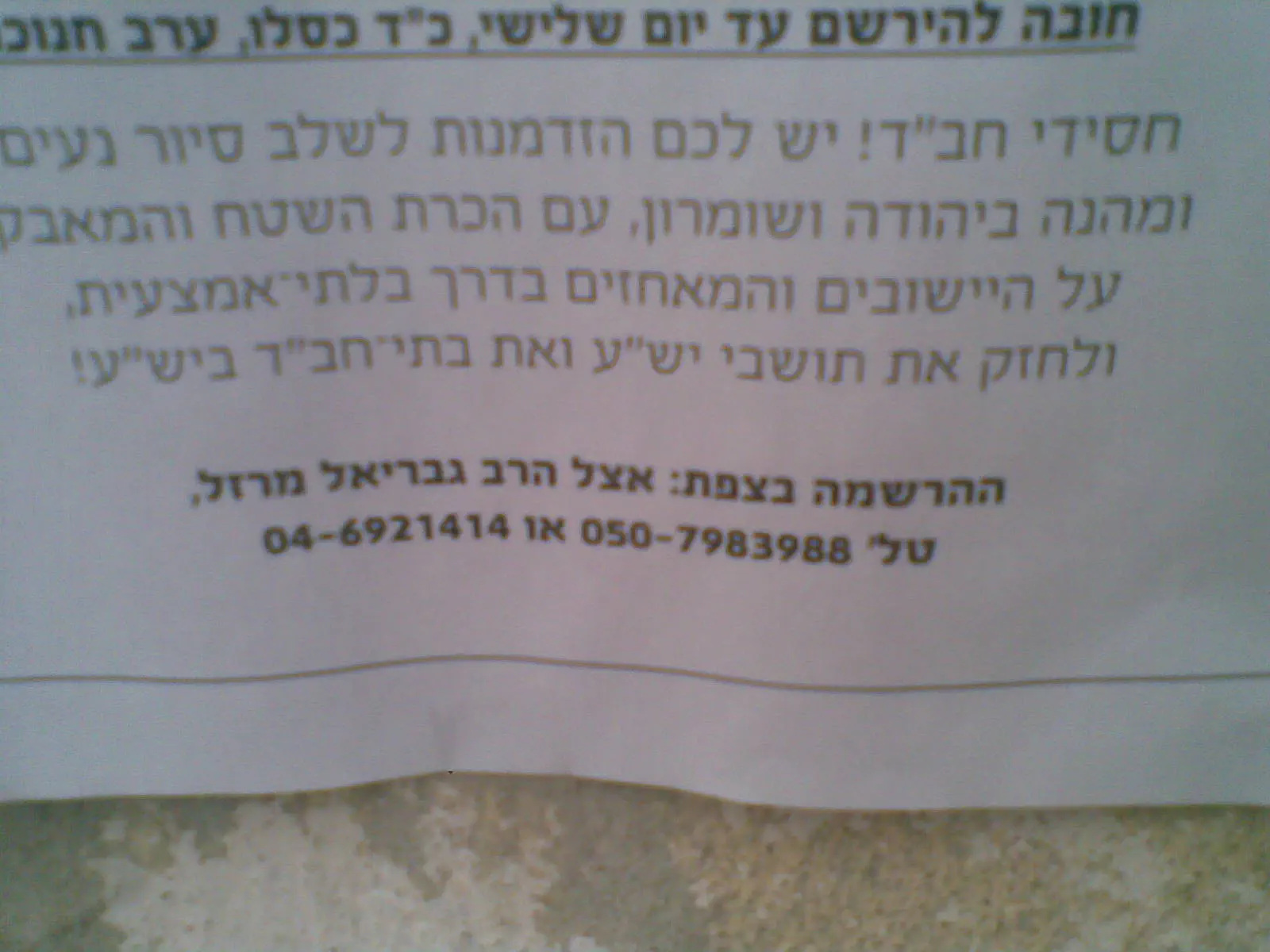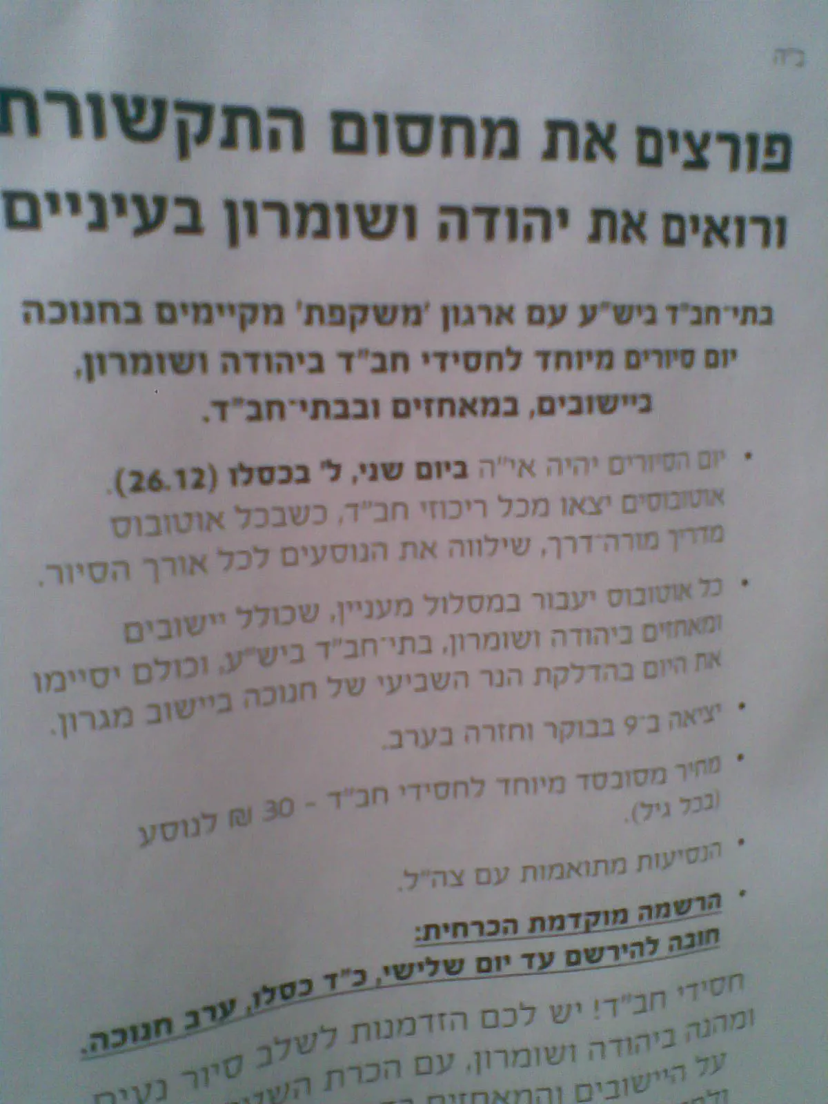 דניאלה .ד.בכל ריכוז חבד"י יש מודעה כזו על מנת להביא כמה שיותר חסידי חב"ד לשומרון.