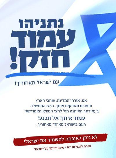 "עלה והצלח בעמידתך מול הלחצים והאיומים למען כבוד עמנו וארצנו. ה' אלוקי מערכות ישראל ישלח לך את עזרו מקודש להצלחת שליחותך הלאומית לטובת העם היושב בציון", נכתב.