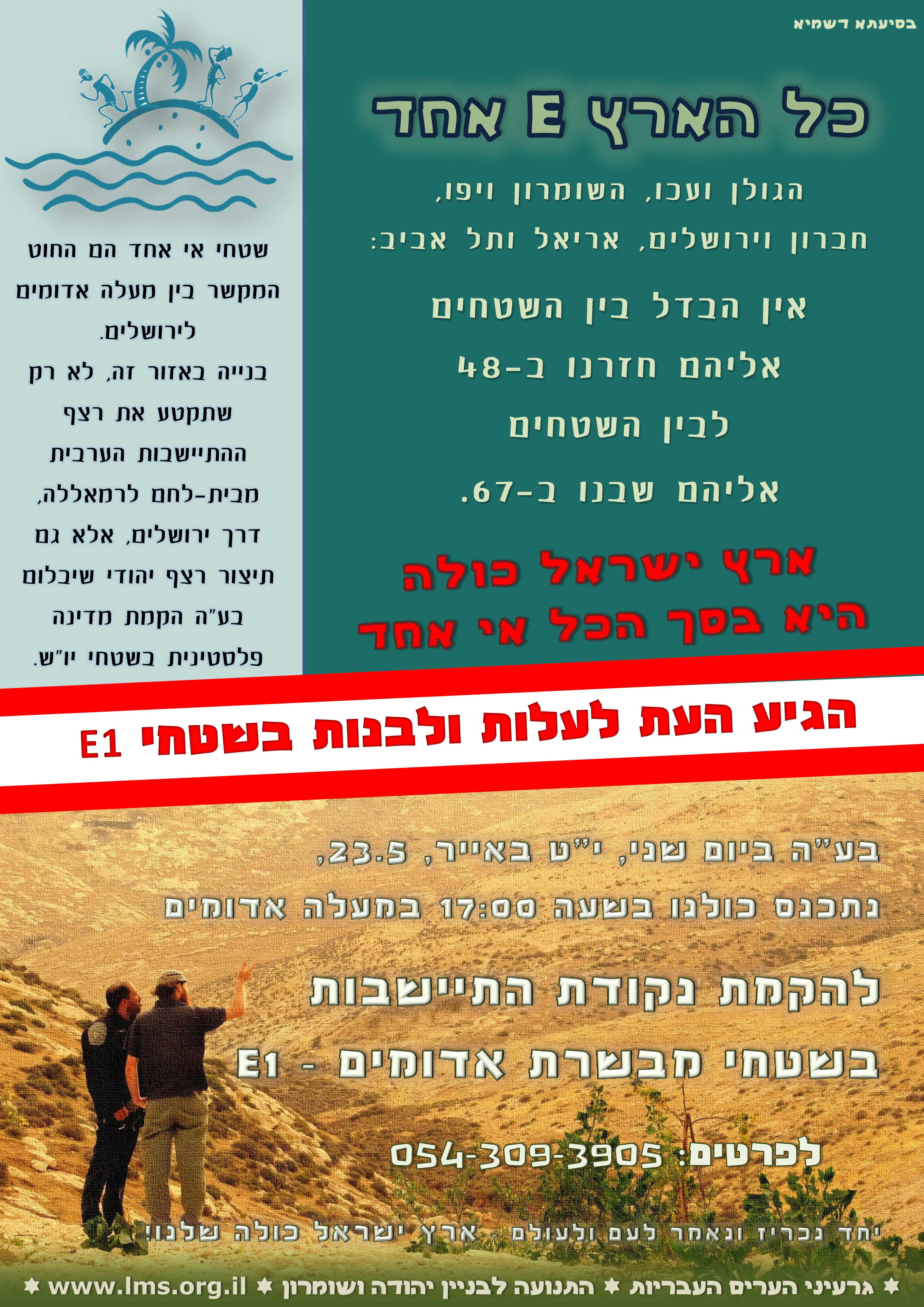 לקראת המהלך צפויים פעילי הימין לתלות בקרוב מודעות בבתי כנסת ובהתנחלויות, הקוראות לתפוס יוזמה ולהצטרף למהלך שמכונה: "כל הארץ אי (E) אחד!". בכרוז, שהגיע לידי ynet, נכתב בין היתר: "אין הבדל בין השטחים שחזרנו אליהם ב-48 לבין השטחים ששבנו אליהם ב-67. ארץ ישראל כולה היא בסך הכל אי אחד... שטחי אי אחד בין מעלה אדומים לירושלים הם צוואר הבקבוק. חיבור מעלה אדומים וירושלים יהווה חיבור של רצף יהודי, שיבלום את הקמת המדינה הפלסטינית בשטח ויקטע את הרצף מבית לחם לרמאללה דרך ירושלים".