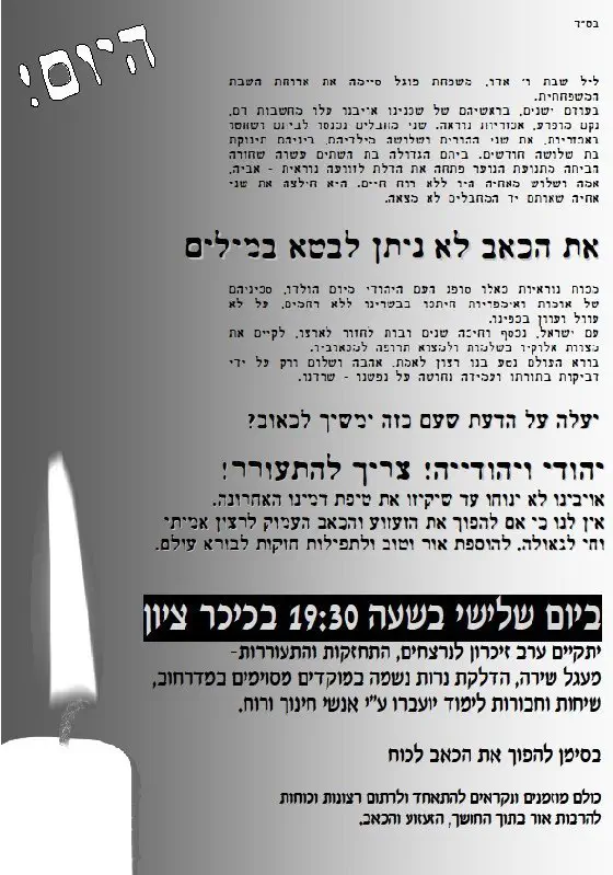 אלף חללים!!! מישהו שילם את מחיר הדם הזה? מישהו נתן על כך את הדין? לא! להיפך, אחד מהחבר'ה שדאג לתת להם רובים, היום הוא הנשיא! אחד נוסף- הוא סר הבטחון! (הטעות במקור). איזה עונש ואיזה דין? זה ממשיך בכך שדמנו הפקר ממש, שכלנו רבים וטובים, רק בזמן האחרון נרצחו בגטו– עידודי זולדן, הרב מאיר חי, חמשת בני משפחת פוגל! ועוד צדיקים.