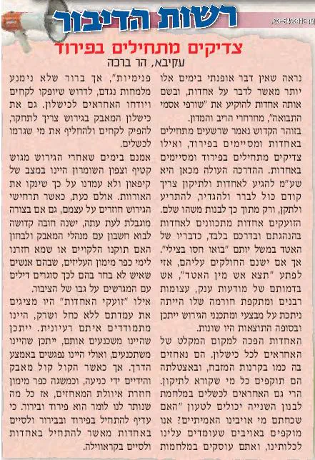 דניאלה וייס לשעבר ראש מועצת קדומים מהפעילות הבולטות של התנועה להקמת מאחזים בארץ ישראל, וכיום פעילה בתנועת נחלה, תנועה להתיישבות בארץ ישראל, טוענת כי ההפגנה השבוע בירושלים הזכירה לה את המראות של רפיסות הרוח, בהפגנות לפני הגרוש מגוש קטיף וכפר מימון.