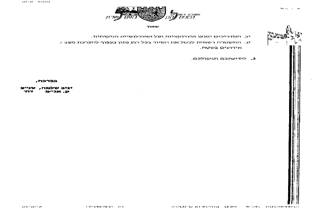 לסיום הצהירו, "לאור "מאורעות הדמים" בשבוע שעבר, החלטנו לצאת ולפעול אקטיבית נגד ה"מפגע הבטחוני" שנוצר סמוך לבתינו; אחד הרעיונות שעומדים על הפרק הוא להציב שמירה נוספת מטעמינו, שתהיה קפדנית יותר ותמנע כניסה של ערבים חשודים. ראינו לנכון להודיע לך על תוכניותינו, היות וייתכן ותיפגע מהן פרנסתך".