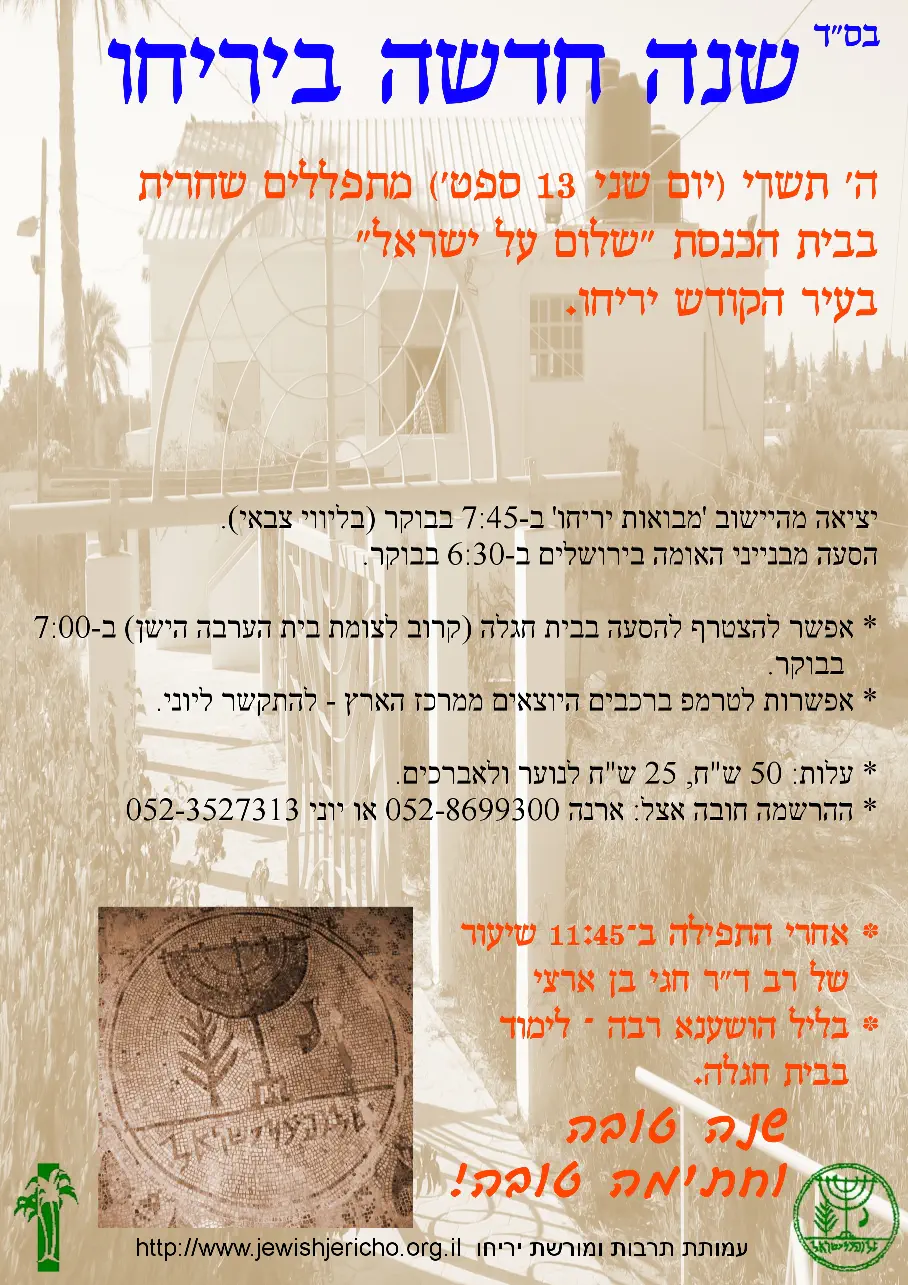 ביום שני, ה'תשרי (13/09/2010), תפילה שחרית בבית הכנסת העתיק "שלום על ישראל" ביריחו (בלווי צבאי).
