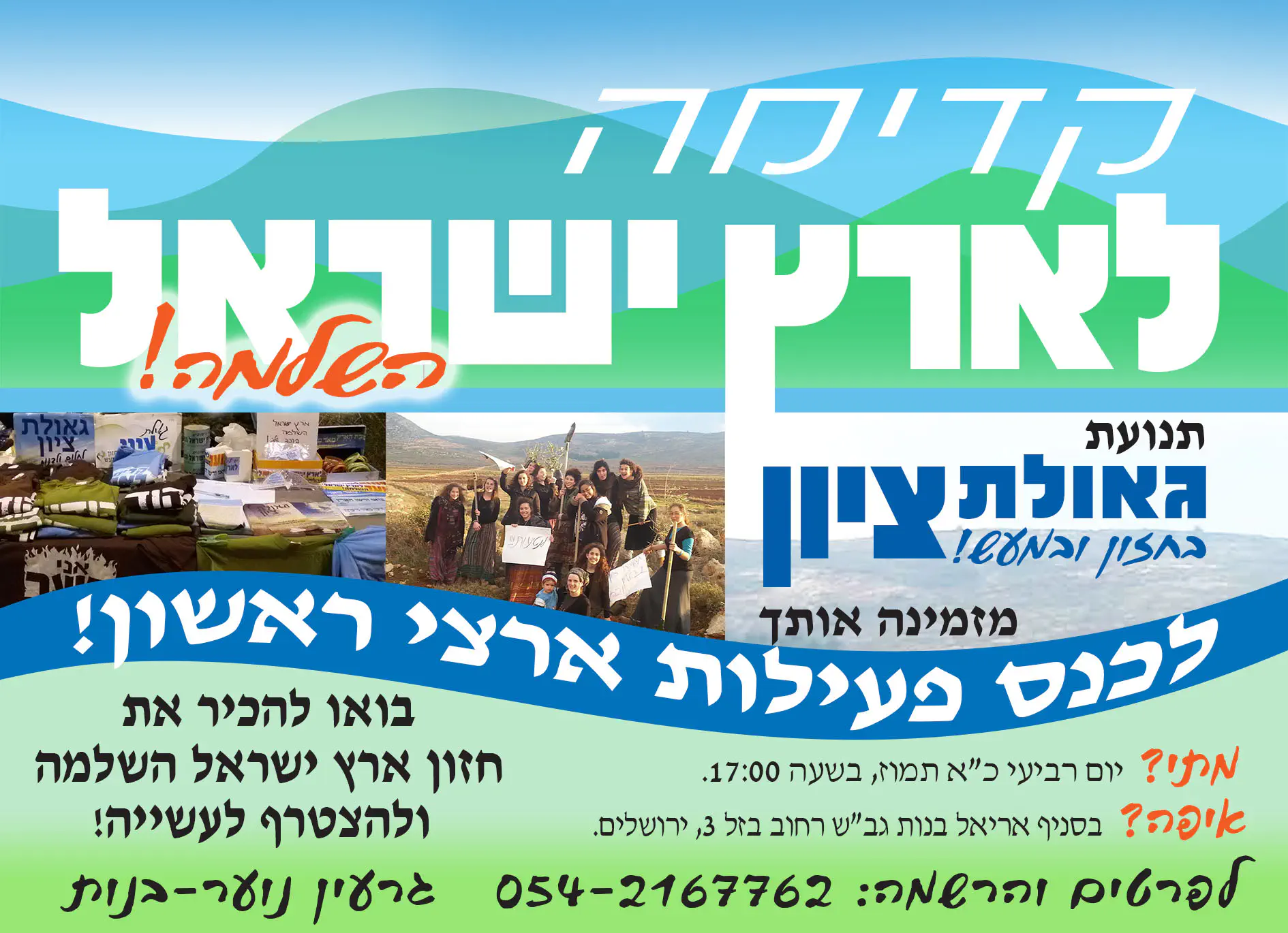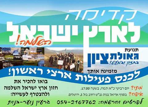 כל מי שארץ ישראל חשובה לה, כל מי שיודעת ש'הארץ נשארה הרבה מאד לרשתה', כל מי שרוצה לפעול למען ארץ ישראל- מקומך איתנו! בואי לשמוע על חזון ארץ ישראל השלמה ולהוריד את הרעיון למעשים בשטח!