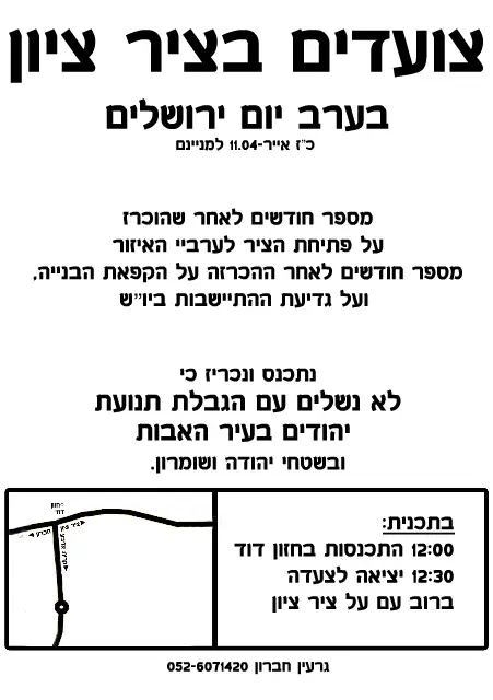 יובל סופר, בן 18, סיפר ל"הארץ" כי ביום שלישי האחרון הוא עמד בשעת צהריים בטרמפיאדה בצומת תפוח, המובילה ליצהר. "בלשים במכונית אזרחית ביקשו ממני תעודה. שאלתי אותם מי הם. היו שם שלושה בלשים (שמותיהם שמורים במערכת) ואחד הבלשים הכניס לי אגרופים בפנים. הם הכניסו אותי לאוטו והבלש אמר לי 'אתה כלב אשפתות, ניכנס בכם אתם לא שווים כלום, מה אתם מרביצים לחיילים?'". לדברי סופר, שהגיש את תלונתו באמצעות ארגון זכויות האדם בישע, "הגענו לתחנת המשטרה באריאל, לחדר של הבילוש. הוא ישב מולי והמשיך לקלל אותי. בשלב מסויים הוא בעט לי בברך והשוטרים האחרים עצרו אותו. נגרמה לי חבלה בברך ובשפה בגלל המכות". ממשטרת מחוז ש"י נמסר, כי "החשוד סירב להזדהות בפני השוטרים. הוחלט לעכבו על מנת לזהותו. בשלב העיכוב תקף את השוטרים ונעצר". במוצאי יום העצמאות פרצו עימותים קשים ביצהר בין כוחות הביטחון לתושבי ההתנחלות, שבמהלכם נפצע חייל צה"ל באורח קל מפגיעת בקבוק צבע שהושלך לעברו ופגע בפניו, בנוסף, נוקבו גלגליו של רכב צבאי. גורמי צבא בכירים תקפו בחריפות את המתנחלים שהכו ויידו אבנים ובקבוק בחיילי הנח"ל ליד יצהר. "האנשים שהתפרעו שם הם חלאות", אמר אחד הקצינים ל"הארץ". "הם אפילו לא מייצגים את מתנחלי יצהר". במכתב שנשלח לתושבי ההתנחלויות בגב ההר, בעקבות אירועי יום העצמאות, כתבה מזכירות יצהר, כי לא מדובר רק במאבק של יצהר "אלא של כל ההתיישבות, יש חשיבות במאבק נגד הגזרות". (נ.ב. מישהו יודע מה חדש עם ש.מ. ויובל?) | |||||||||||||||