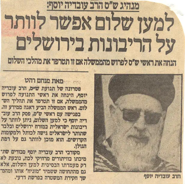 לא פעם הסברתי מכבר, כי פסק ההלכה אשר נתתי בזמנו "שטחים תמורת שלום", אינו תקף כלל לרגל המצב הנוכחי. אני התכוונתי אך ורק לשלום אמת, בו ירושלים וסביבותיה ישכנו לבטח, בשלום ושלווה. אולם עתה, עינינו רואות וכלות כי אדרבא, מסירת שטחים מארצנו הקדושה, גורמת לסכנת נפשות.