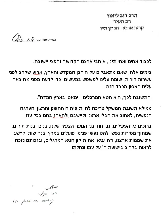 יהי רצון שרוח חדשה זו תגבר ותתעצם, תמחק את חרפת כפר מימון, ותרומם את עם ישראל להבנת המהות העמוקה של ארץ ישראל, דבר שהוא תנאי הכרחי להצלחת המאבק שלנו נגד אויבינו מבית ומחוץ.