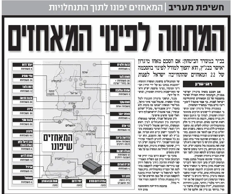 "ראשית יפתו את המתנחלים מהישובים הקטנים "להעתיק" את מגוריהם לתוך "גושים". מהר מאד יהפכו הגושים לגטאות בכל מובן המילה- הרי אין בנייה ואין התרחבות. דחיסת היהודים לגטאות בגושים יקל על מלאכת חורבן ההתיישבות כשכל הגבעות כבר יהיו בשליטת אש"פית-חמאסית ולא יהיה ניתן להתרחב. מתנחלי "הגושים" יתבקשו "להעתיק" את מגוריהם לגוש הקטן, מדינת ישראל בגבולות 48".