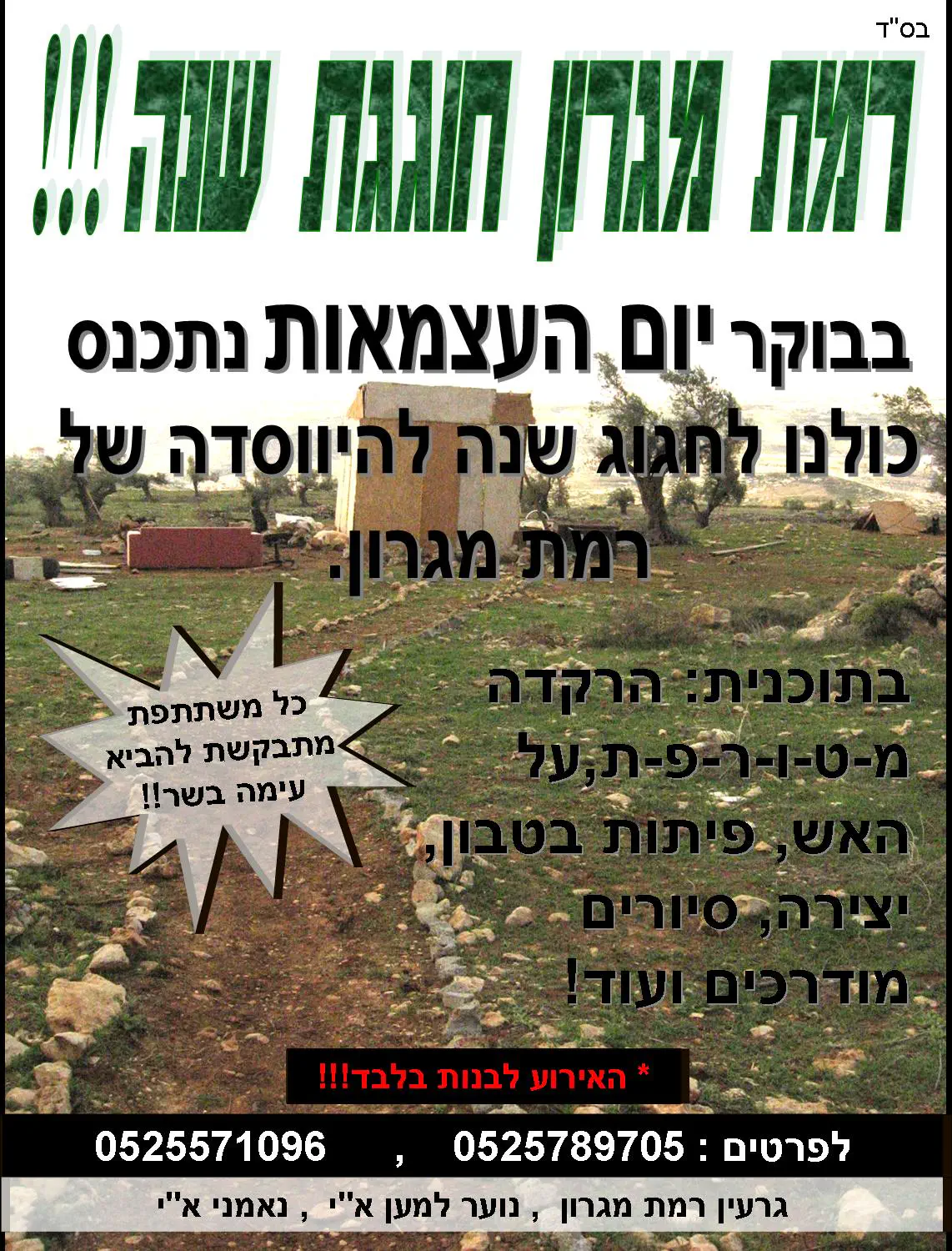 גם מאות בני נוער חדורי אש-קודש שישהו במאחז למשך השבת יעזבו במוצא"ש והמאחז ישאר שומם וריק, כמו בכל ימות השבוע. כל עוד אין מתיישבים קבועים או משפחות שמתגוררות במקום, אולי הצבא יתעצבן וינסה לפנות אתכם, אבל ישוב קבוע בא"י זה לא יהיה.. וחבל.