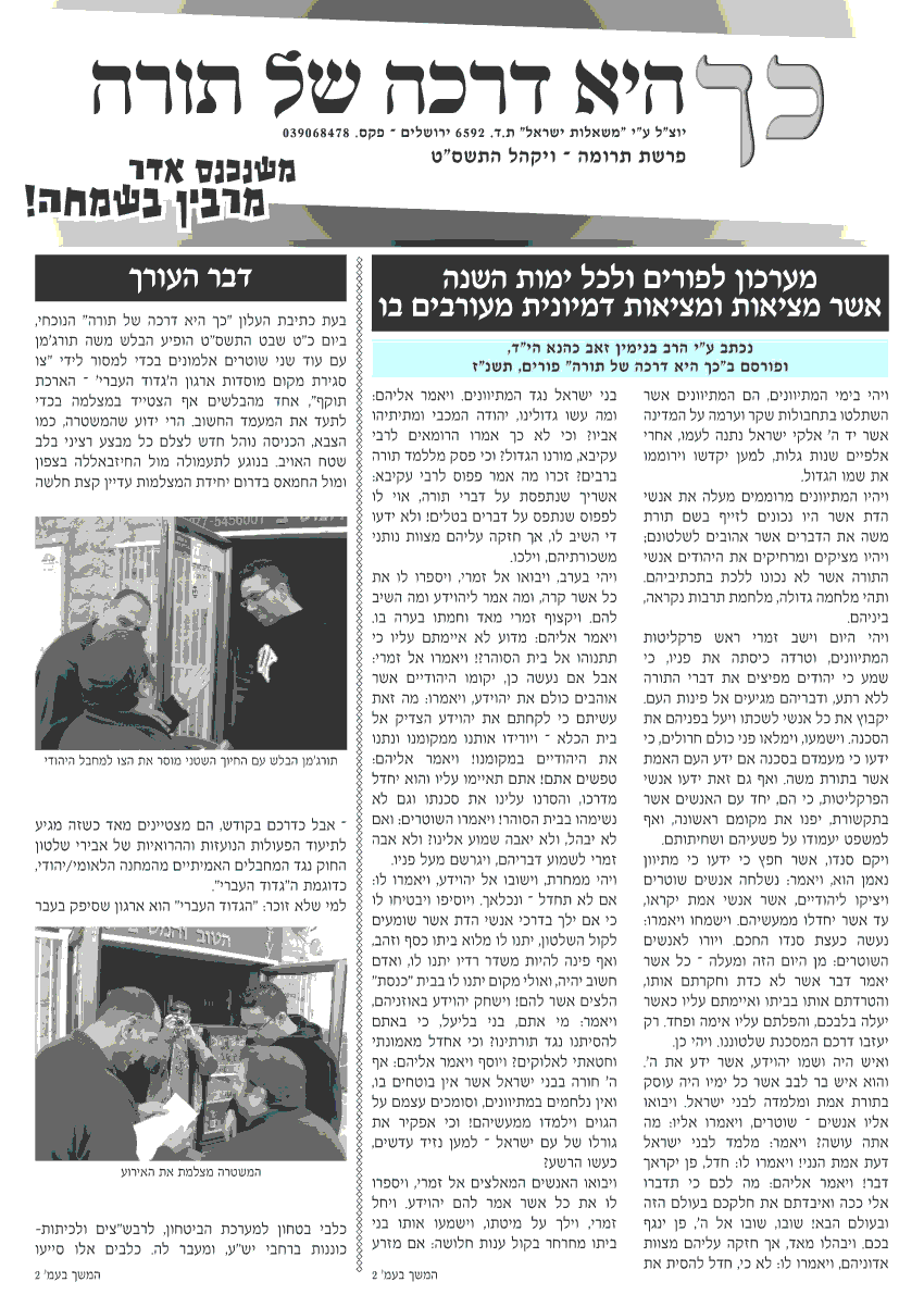 בברכה אנשים שהרגישו זלזול בנציג הציבור ח"כ ד"ר מיכאל בן ארי. אפשר להאשים אותו במשטרה בפגיעה ב'סמל מדינה'otk100אחרונהאו שבעצם רק ח"כים מקדימה הם 'סמל מדינה'... דרכה של תורה - פורים תשס"חואלאדנא ללחוץ על כל תמונה בנפרד כדי לקרוא בבירורואלאדיש מצב להירשם לאנשיהוא כדי לקבל את העלון במייל?The yehudiאתה יכול להרשם ולקבל אפילו בסנייל מיילואלאדדהיינו דואר זוחל - בתיבת בדואר.