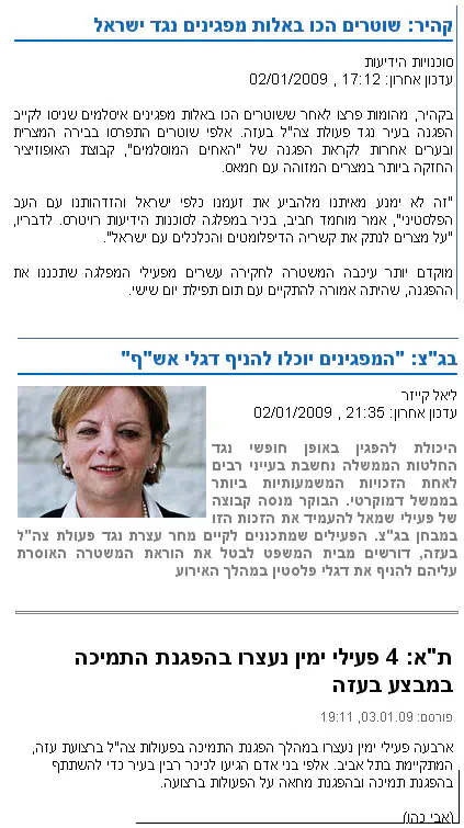 הפגנתם הצטרפה למחאת "ערביי ישראל"- זיהוי מיגדרי מופרך בפני עצמו. כל אלו נדמו עד היום והחלו להתעורר רק בשבוע האחרון. הם לא מחו כשאנשי החמאס השליכו ערבים אחרים מגגות, לא כשחמסניקים רצחו השבוע את הפליטים מבין אסירי הסראיה המופצצת והם אינם מוחים בזמן הקציר היומי בעיראק בו טובחים הסונים את השיעים (או להיפך, זה לא ממש משנה למישהו). לעתים נדמה לי כי מחאת הערבים כלל אינה נובעת ממניעים אנטי-ישראליים, אלא משום שהם חשים באיום על המונופול שהם תובעים לעצמם בכל הקשור להרג מוסלמים אחרים. על מחאה בשל הרג יהודים כלל אין מה לדבר. בנוסף, הערבים, ואפילו דעה נגדית