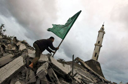 פלסטיני מניף את דגל חמאס על הריסות המסגד בעזה (צילום: AFP)