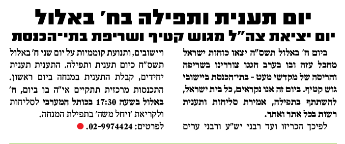 ביום שני הקרוב - ח' אלו יחול צום ותפילה על חורבן וגירוש גוש קטיף - על יציאת כוחות הגירוש (ה' ישלם להם כ'גמולם') מגוש קטיף, ועל חורבן בתי הכנסת.