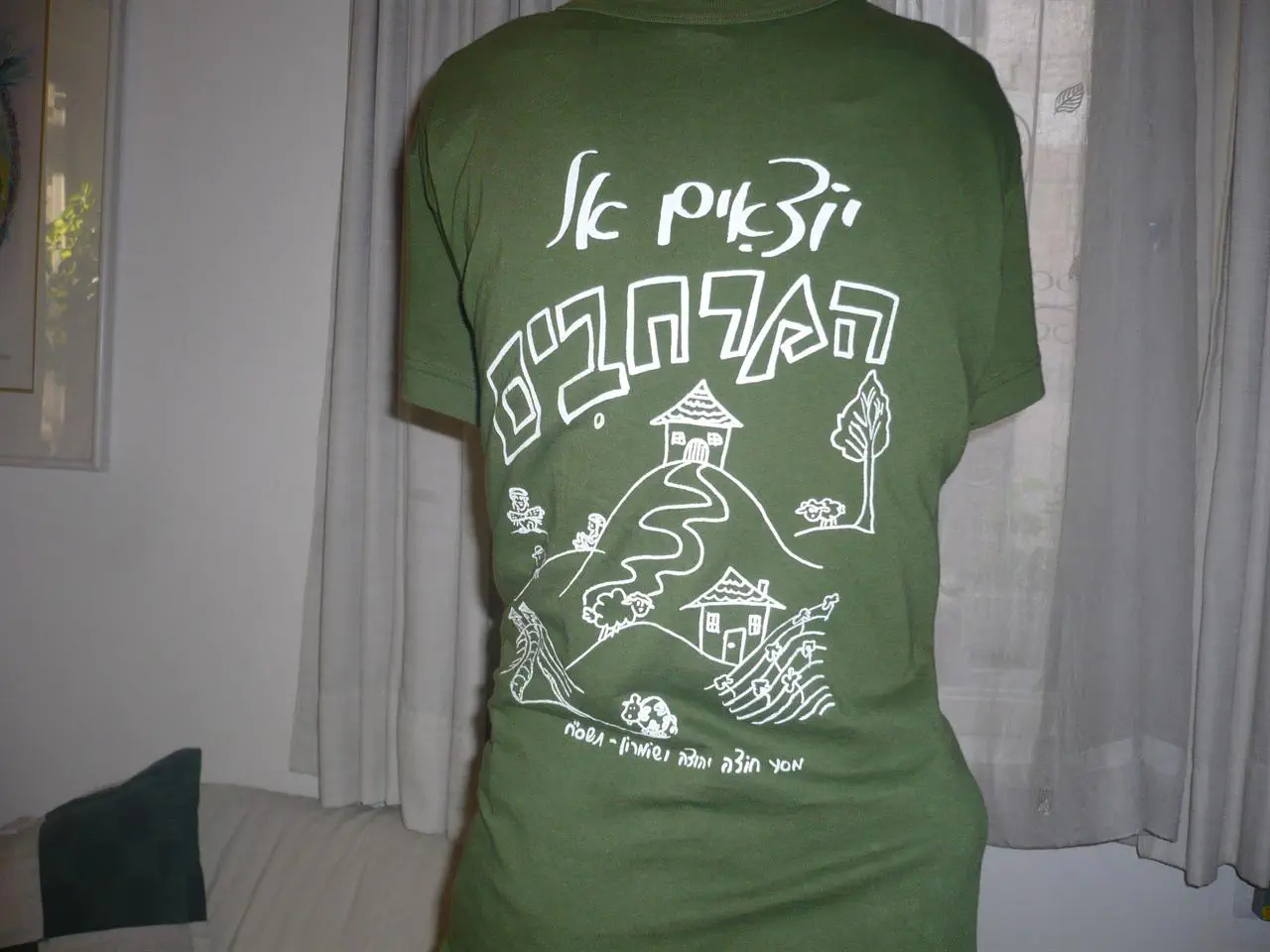 אירגנו חולצות של המסע חוצה יהודה ושומרון. הן ירוקות, מדימה למעטה רשום 'טובה הארץ מאוד מאוד' ומאחורה יש ציור של גבעה ורשום שזה של המסע. יצא ממש יפה.