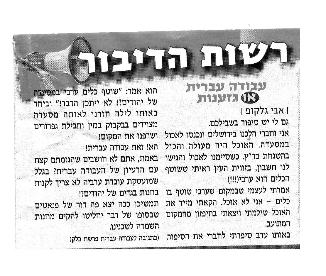 מי שקורא עולם קטן בטח ראה שב"רשות הדיבור" כתבו משהו על "עבודה עברית או גזענות" מי שיכול לשלוח לזה תגובה זה ממש חשוב(רוצים שהמערכת של עולם קטן תהיה מפוצצת במכתבים בעד עבודה עברית.)אשריכם לגמרי.