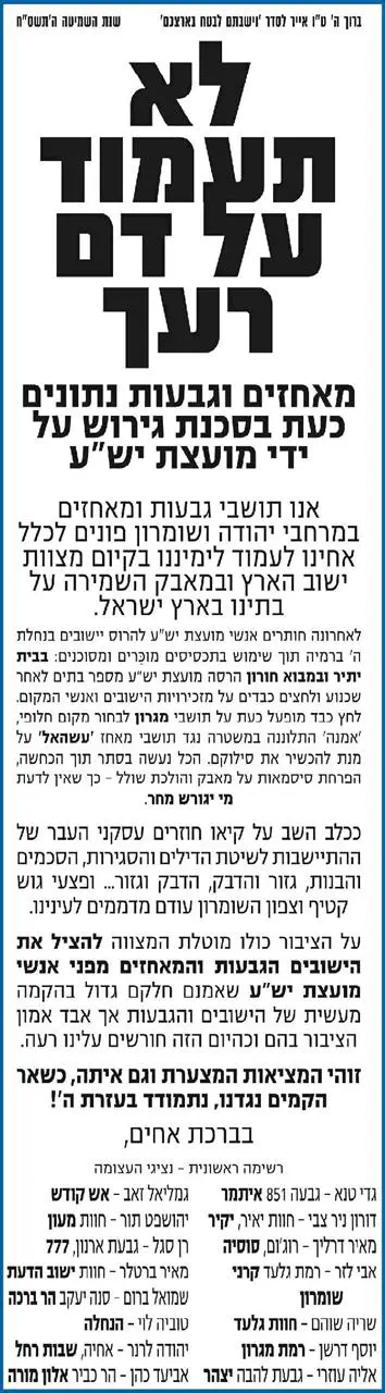 על רקע פינוי המאחזים הצפוי, מסלים העימות החריף בין מועצת יש"ע "הממלכתית" ובין תושבי המאחזים.במודעה שתופץ בימים הקרובים בעלוני בית הכנסת, חותמים נציגי 15 מאחזים ביהודה ושומרון, בשמם המלא, על גילוי דעת תחת הכותרת "לא תעמוד על דם רעך".