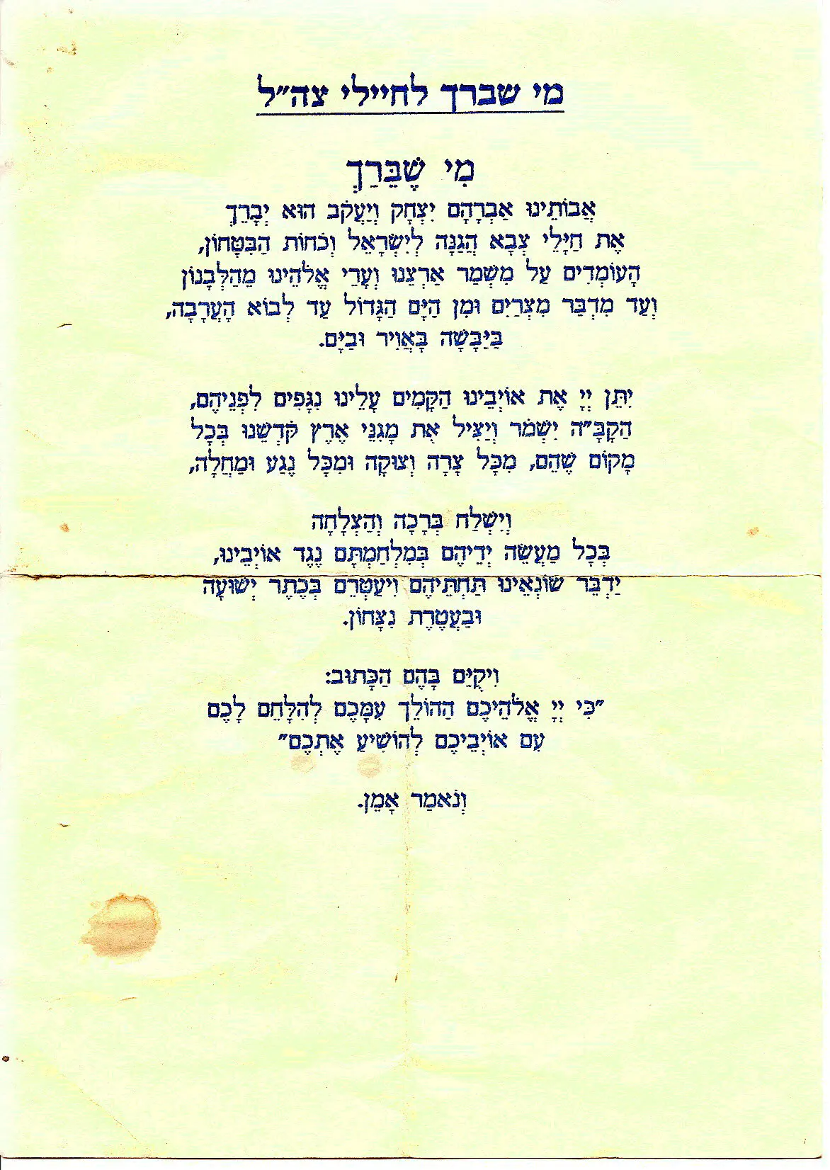 ובמי שברך לחיילים "יברך את המתנחלים בא"י ואת חיילי צבא הגנה לישראל", וגם פה,ישנם תיקונים שאני לא זוכר...