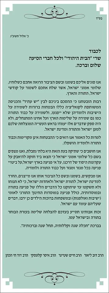 אגב, באף אחד מהמכתבים הבאים אחרי המכתב התומך בברית בנט לפיד אין חזרה עקרונית מהמכתב הראשון. רק הבעת דאגה מחוקים כאלה ואחרים שהקואליציה מקדמת