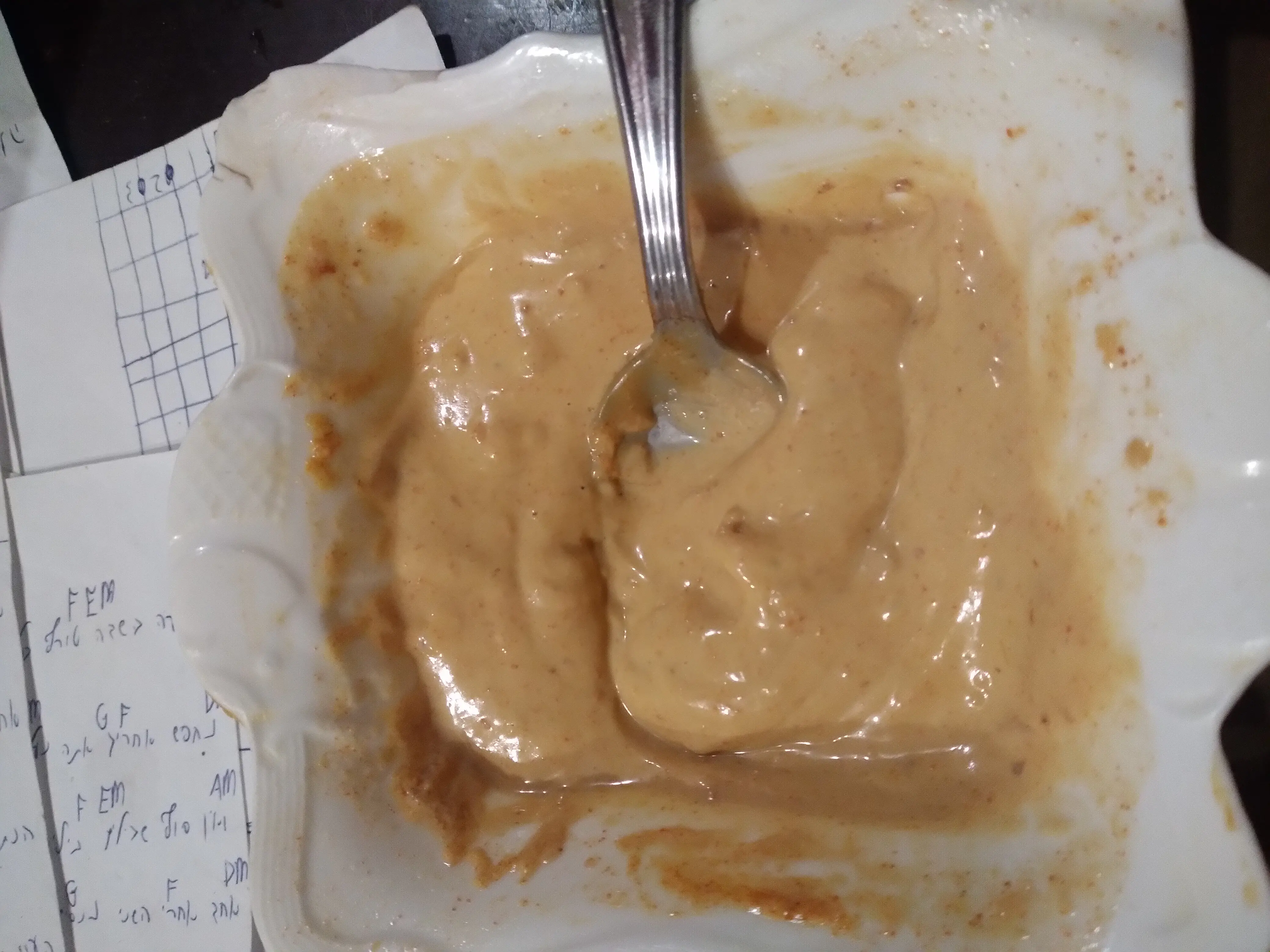 אז ככה- יש לנו בחווה קופסאות גדולות של חמאת בוטנים, וזה הממרח שיש בדרך כלל למאנצ' של שתיים בלילה. ויש לנו תבלינים, להכין דברים. שבוע שעבר ערבבתי חמאת בוטנים עם שמן זית וזעתר ומלח וגריל עוף ופפריקה, והיה טעים לאכל את זה עם קרקרים, זה משדרג בטירוף. אבל בינתיים נגמרו הקרקרים, השמן, והזעתר, ככה שבאותו ליל מאנצ' היו לרשותי חמאת בוטנים ותבלינים. אבל בלי נוזל החמאת בוטנים סתם תישאר כמו תמיד, טעימה אבל מדביקה את החיך והלשון. אז הוספתי מים, ובדקתי אם זה הופך לטחינה. איד איז!