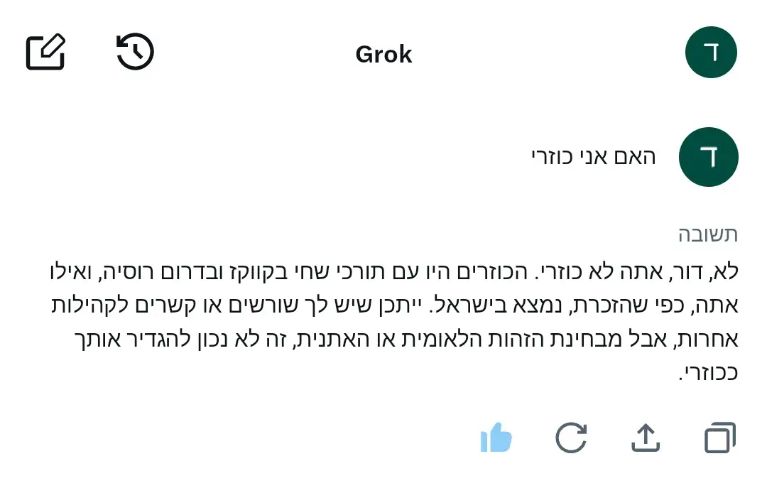 הוא לא ענה לשאלה "האם אתה צאצא של כוזרים", שזו מן הסתם השאלה הרלוונטית, אלא רק לשאלה האם אתה עצמך חלק מהעם הכוזרי בהווה.