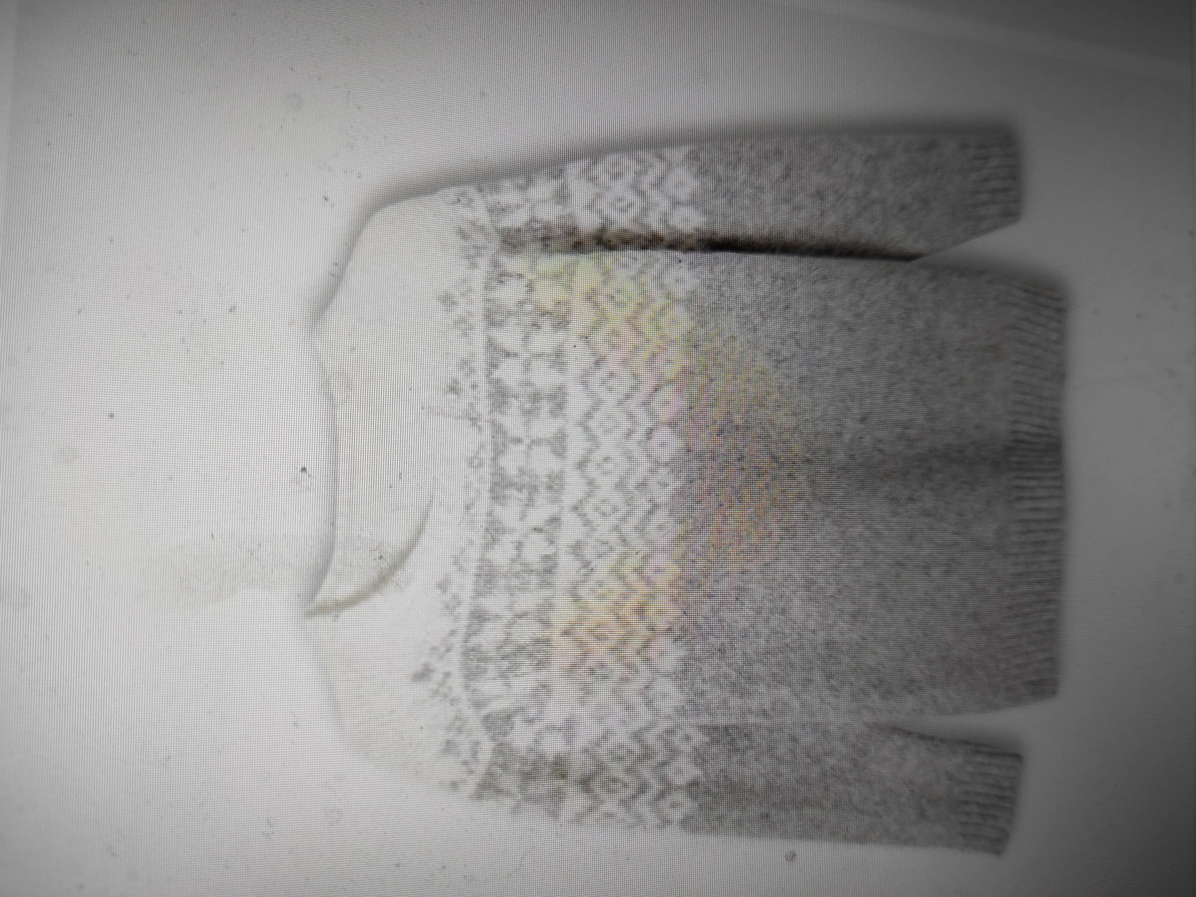 מצאתי סריג מתוק עם חלק תחתון אפור בהיר וחלק עליון של דוגמאות של לבן עם אותו אפור. הצוארון לבן.
