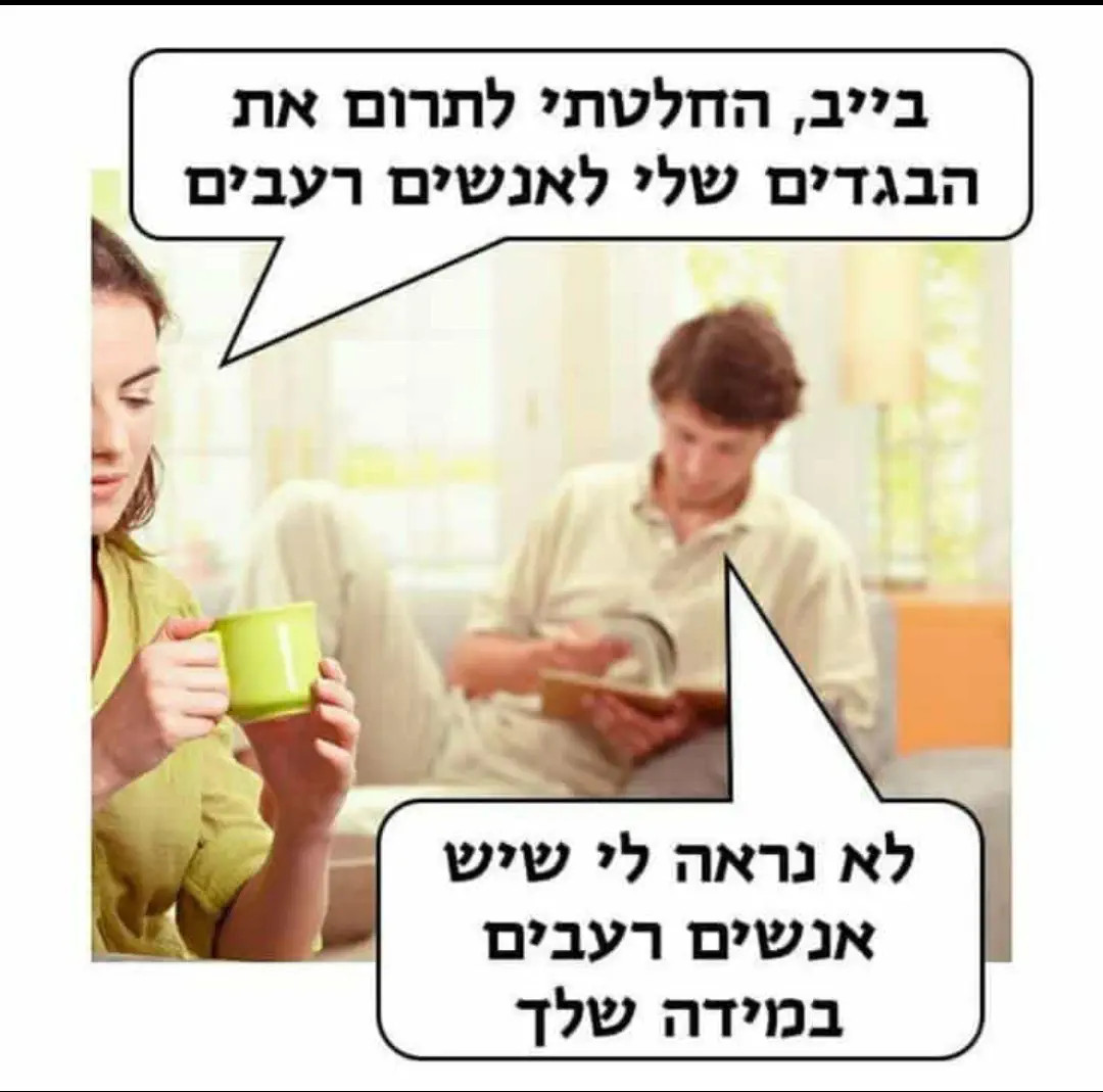 הוא לא ישאיר לי את הבית מבולגן וילך לתפילה או לעבודה ויחשוב שזה מובן מאליו שאני אסדר פה הכל לבד למרות שהוא יכל לפנות לעצמו 10 דק כדי שנעשה את זה ביחד.