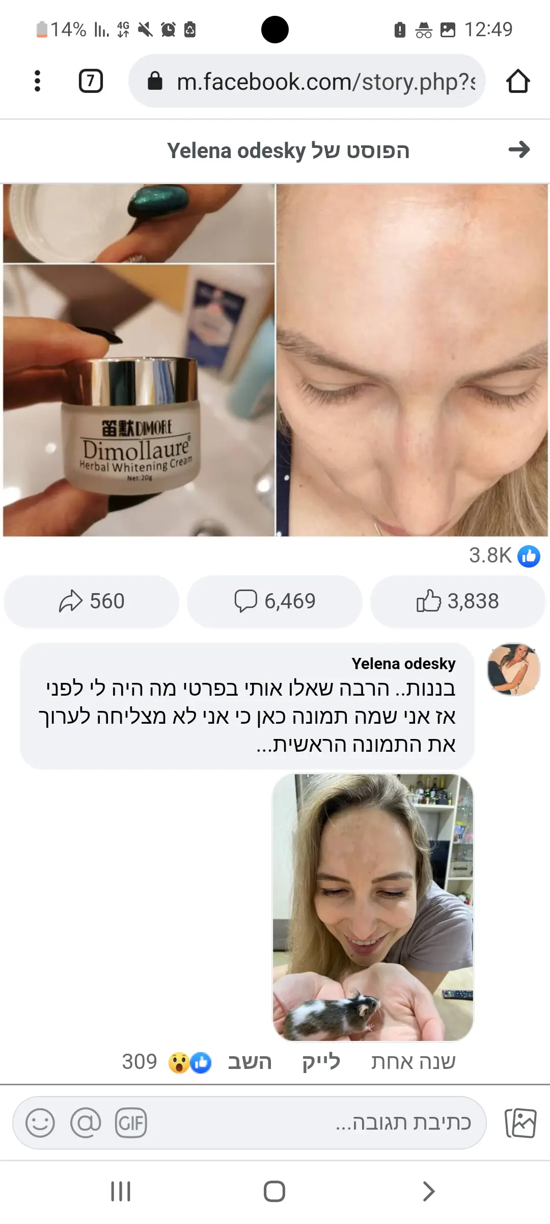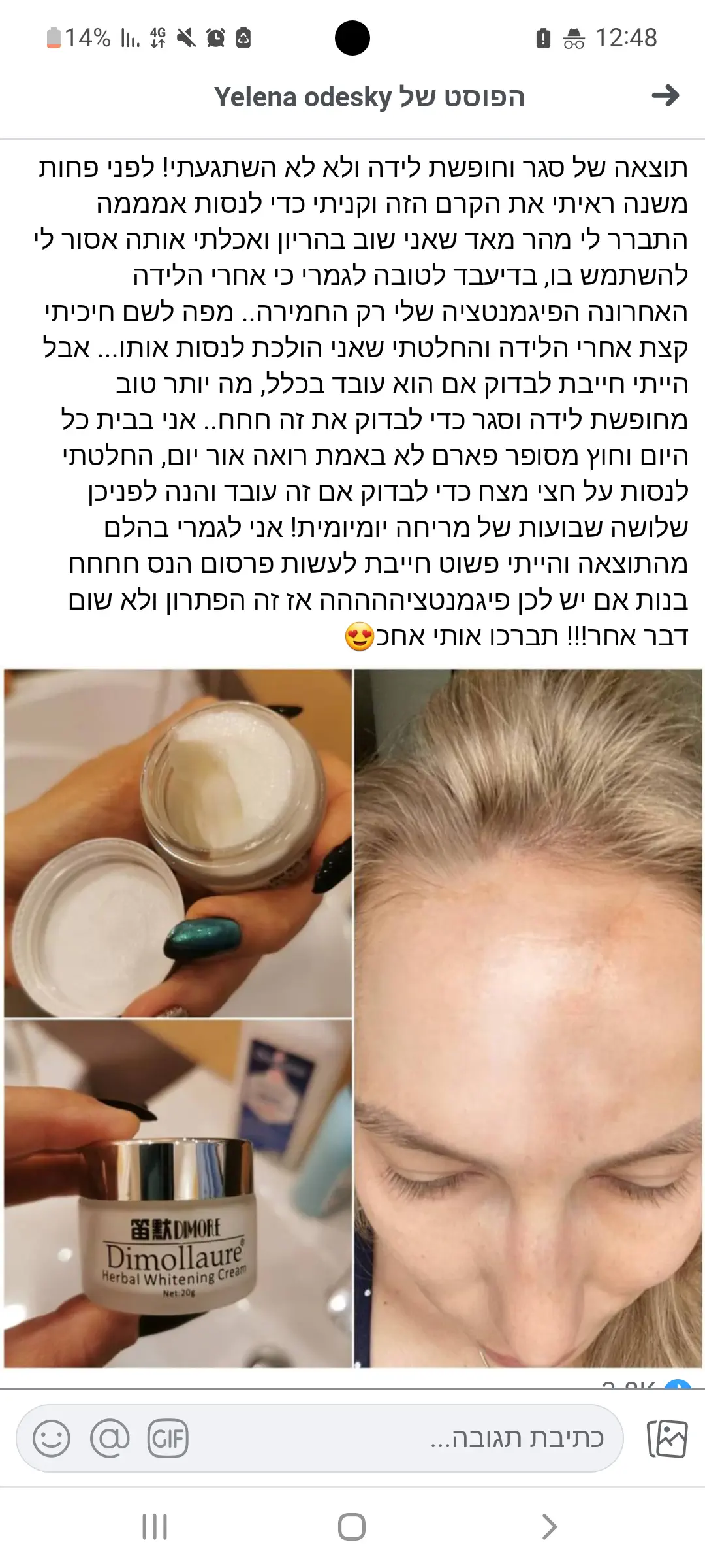 וזה ממש עזר לי תוך כמה ימים! ממש תוך יומיים התחיל להתבהר..מרחתי בוקר וערב וזה עבר לגמרי תוך שבועיים בערך...