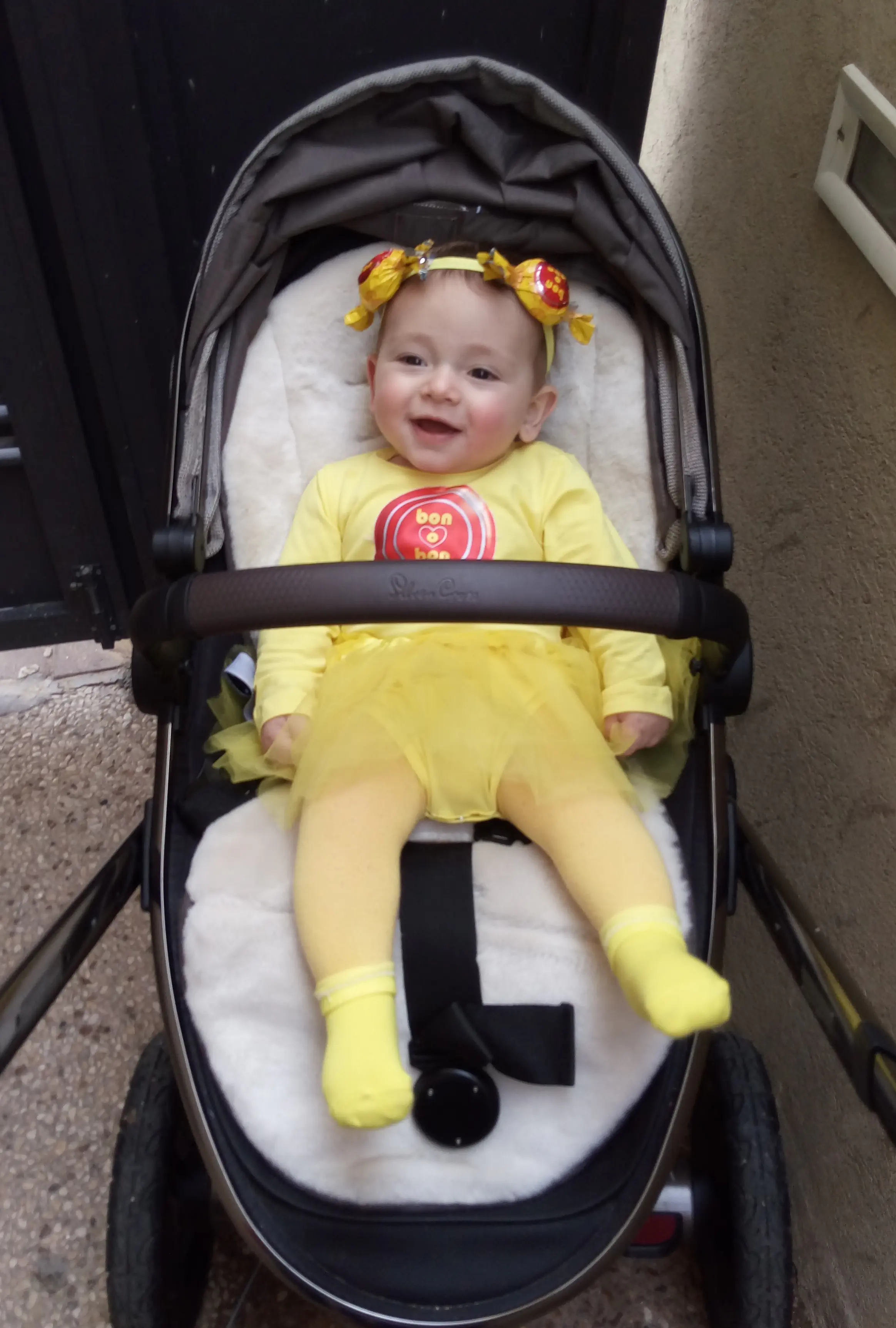 ציירתי עליה עם שבלונה (אפשר לגזור מבריסטול/להדפיס במחשב עיגול סמטרי וכו') ולורד ארטליין שחור עיגול גדול, עיניים וחיוך