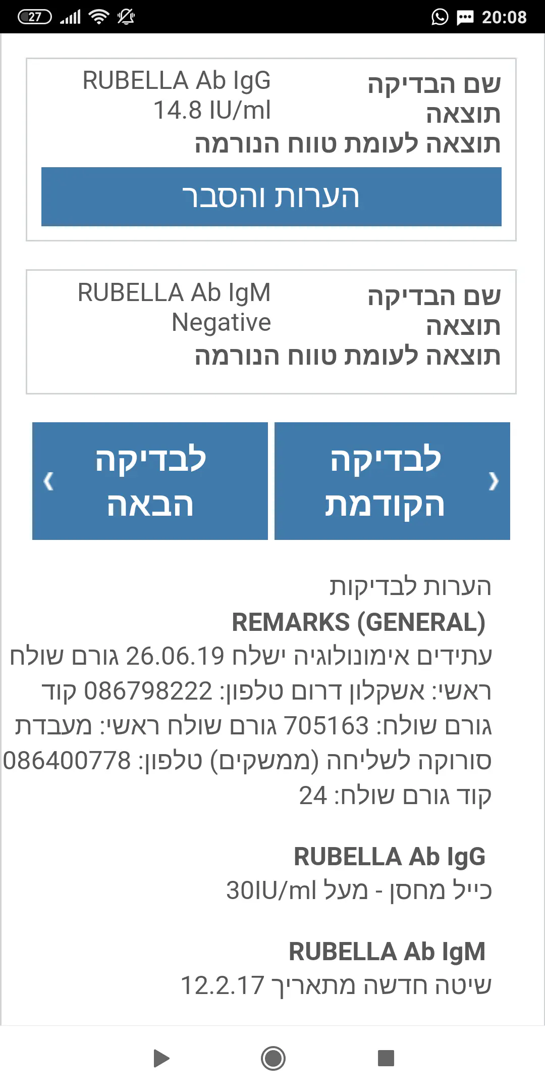 היי מצ"ב תמונה של התוצאות בדיקת דם. אני רוצה לדעת אם אני מחוסנת נגד אדמת. (נשלח לי היום והמרפאה כבר סגורה)