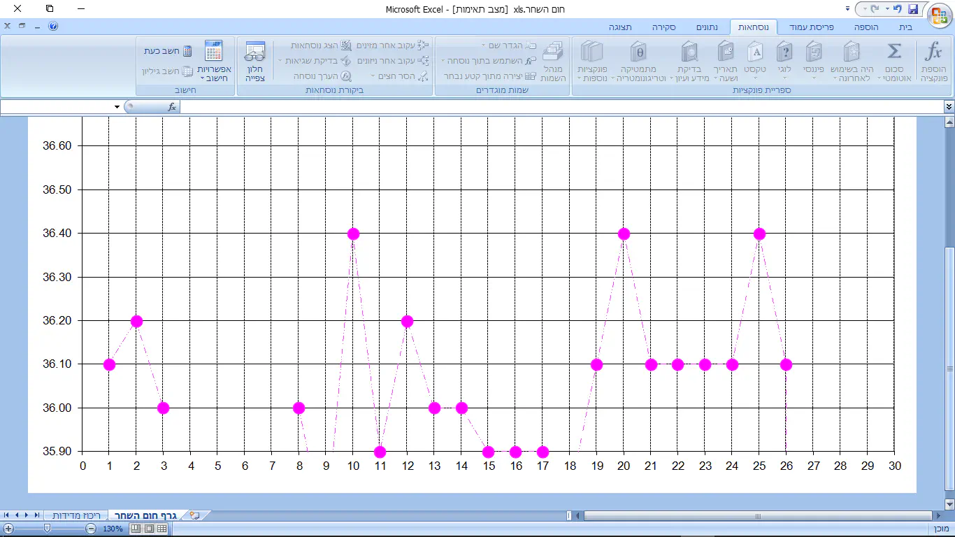 במקביל - בדקתי גם את חום השחר באופן עקבי החל מהיום הראשון לקבלת המחזור. ביום ה-18 למחזור אפשר לראות בדיעבד שהיה הביוץ, כיוון שלאחר מכן יש עלייה של חום (שזה עולה בקנה אחד עם בדיקת הביוץ שעשיתי), אולם כפי שעוד ניתן לראות החום לא עלה משמעותית (מצ"ב הגרף שבניתי).