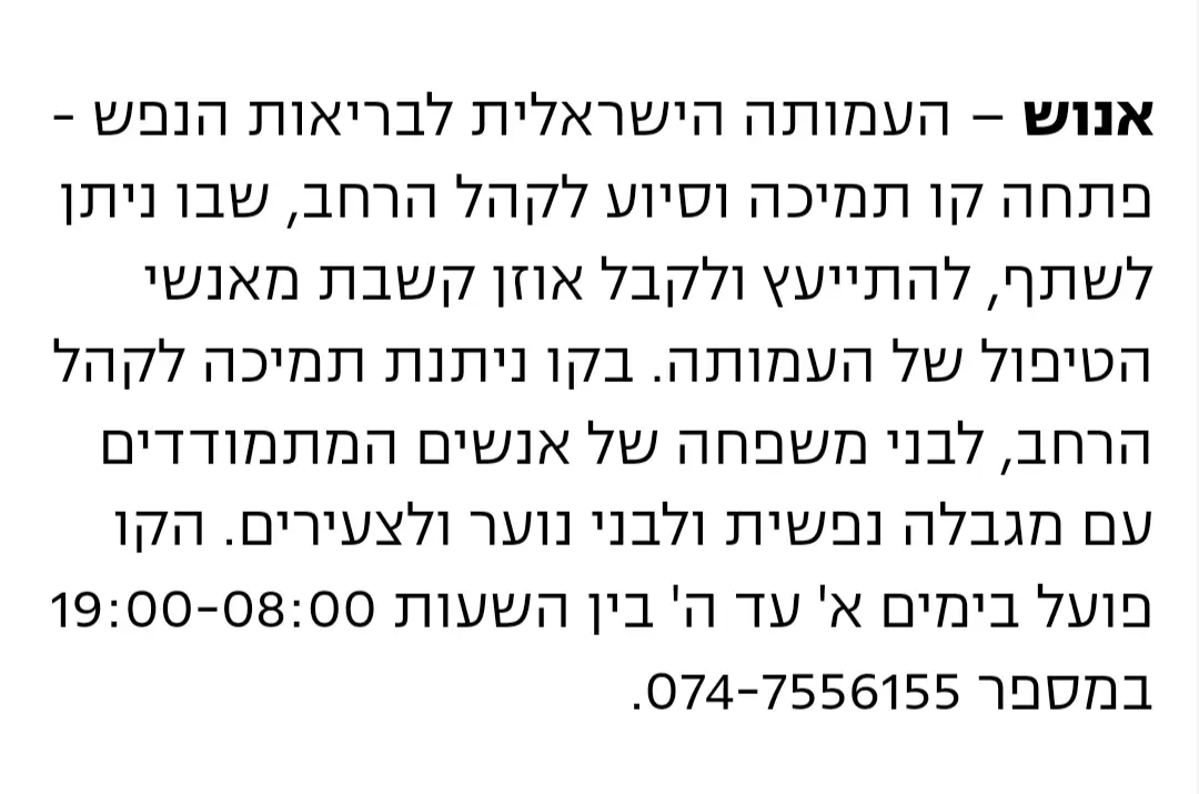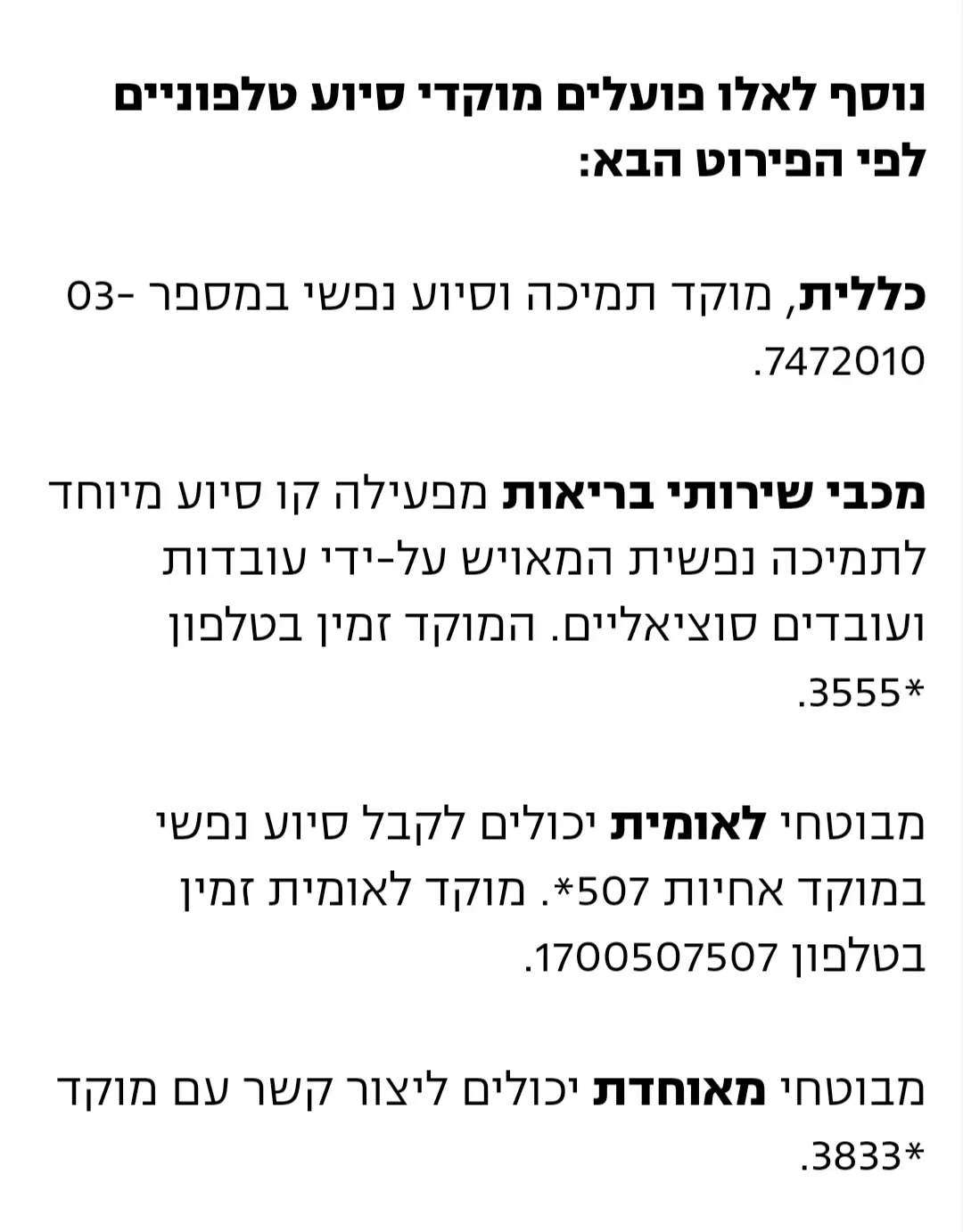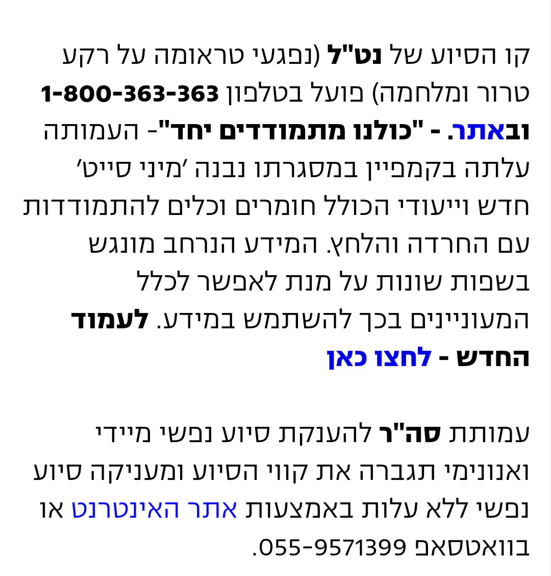 בקישור המצורף יש המון המון מוקדי סיוע ועזרה, לכל סוגי האוכלוסייה בכל מיני תחומים